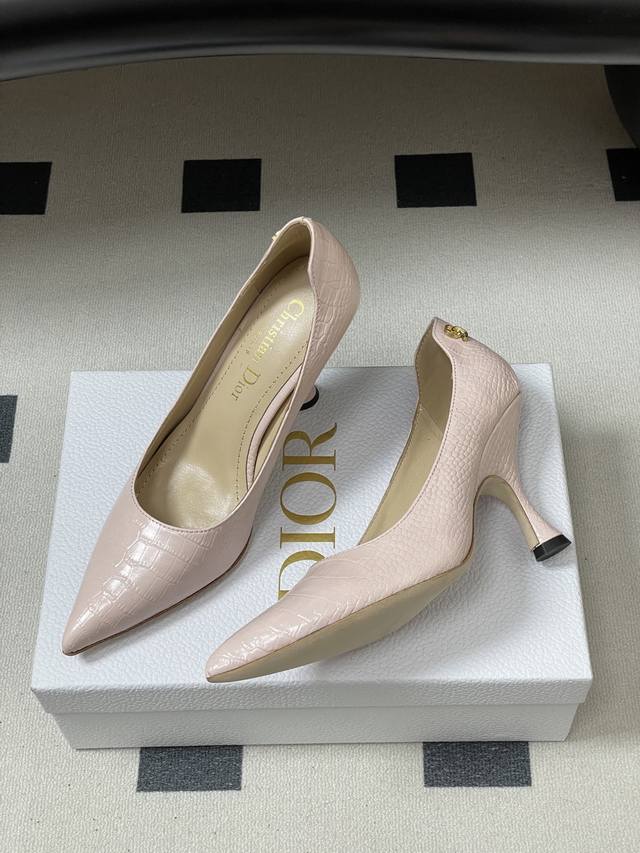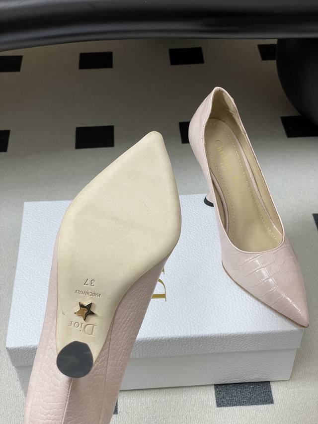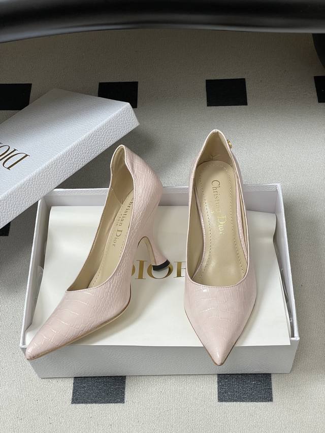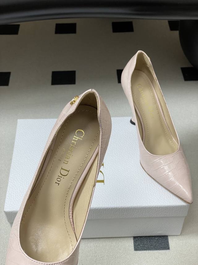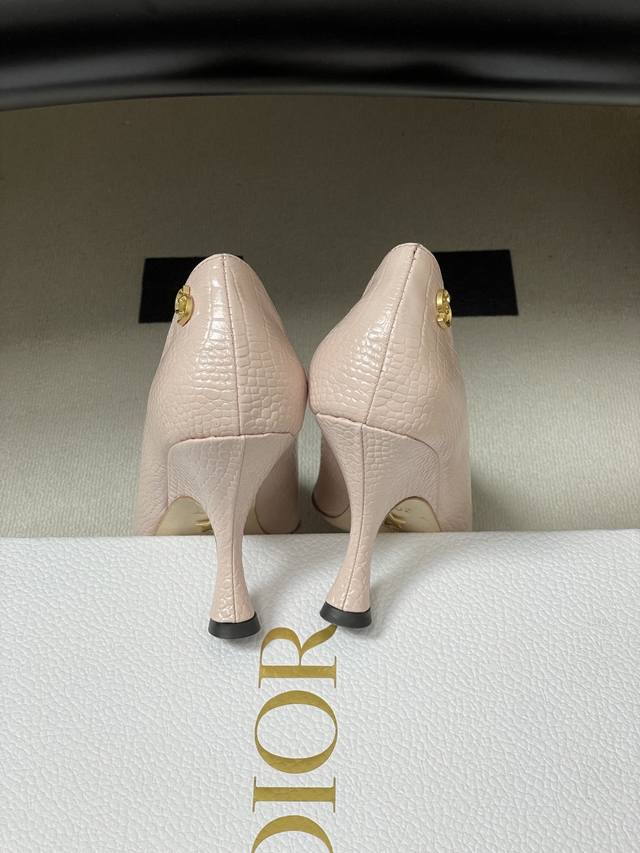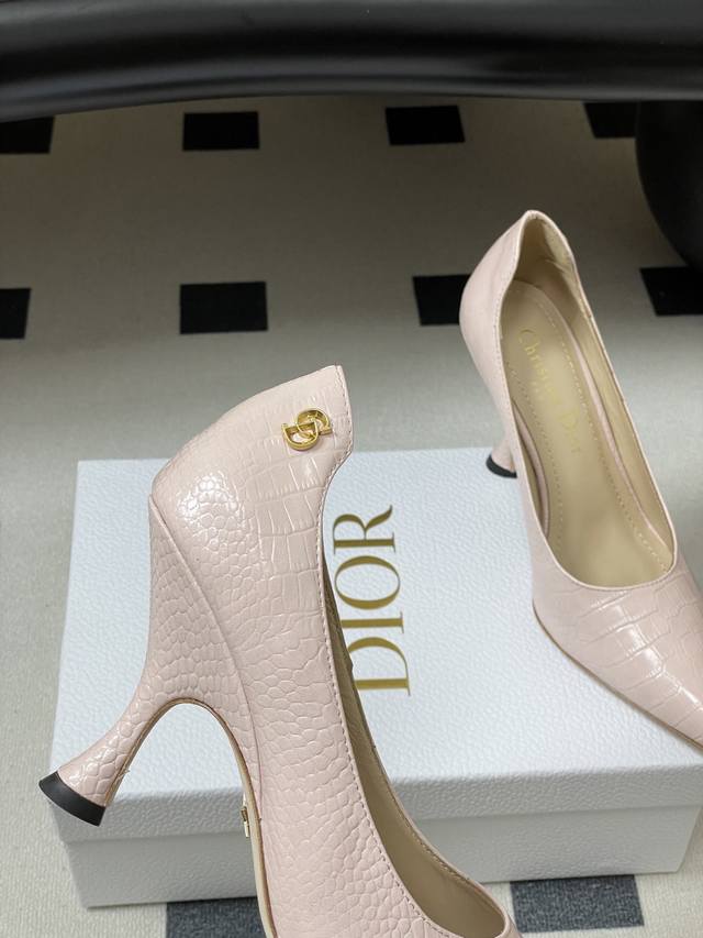 FFF DDD 26Ss春夏新款Dior迪奥最新走秀款Cd字母五金扣鳄鱼纹皮面尖头高跟鞋复古风高跟单鞋 DDD Dior 2026春夏系列高跟鞋,由Jonathan Anderson设计,黑色尖头+金色Cd金属扣,优雅又有现代感。细高跟9.5Cm,修饰腿型,拉长比例,适合职场、宴会等正式场合。鞋面优质皮革,触感柔软,穿着舒适。Cd金属扣是Dior经典标志,彰显品牌历史与创新。整体设计融合经典与玩味,是现代女性气质与自信的象征。 DDD 鞋面:牛皮 羊猄皮 DDD 内里垫脚:羊皮 DDD 鞋底:意大利真皮大