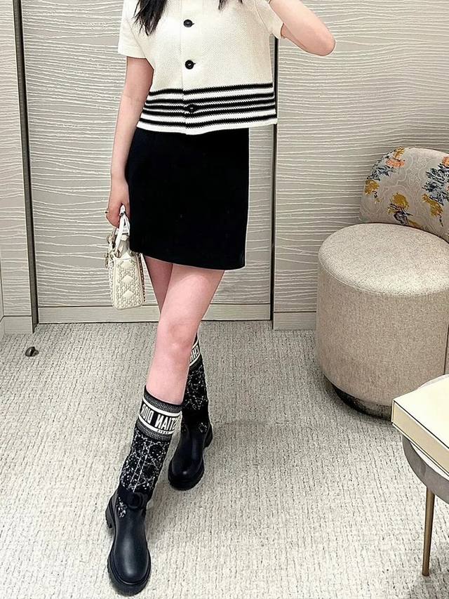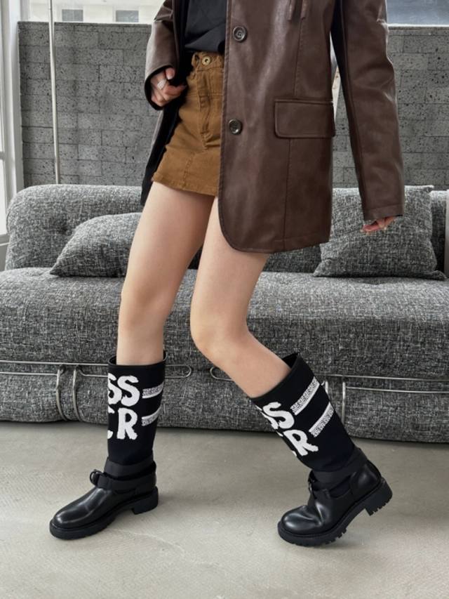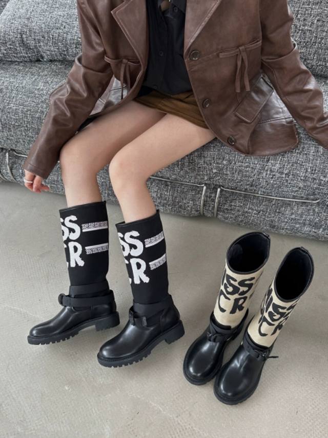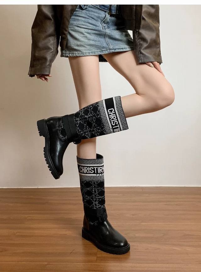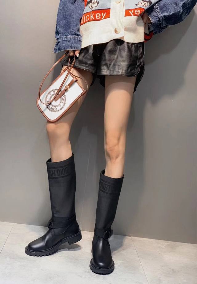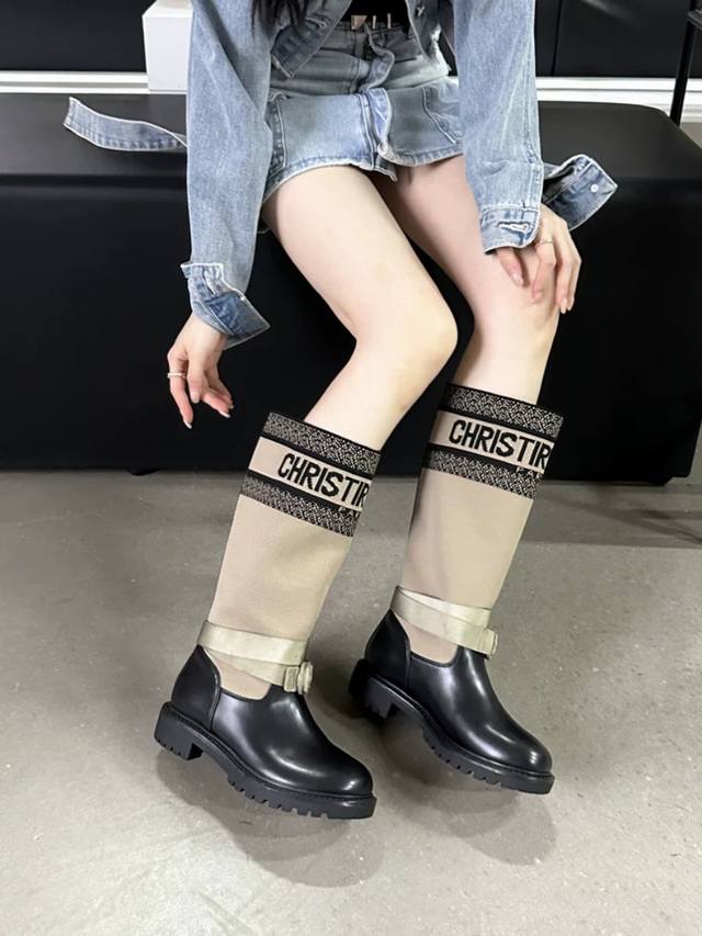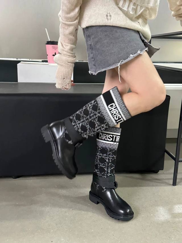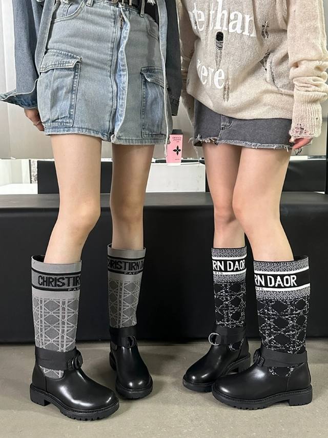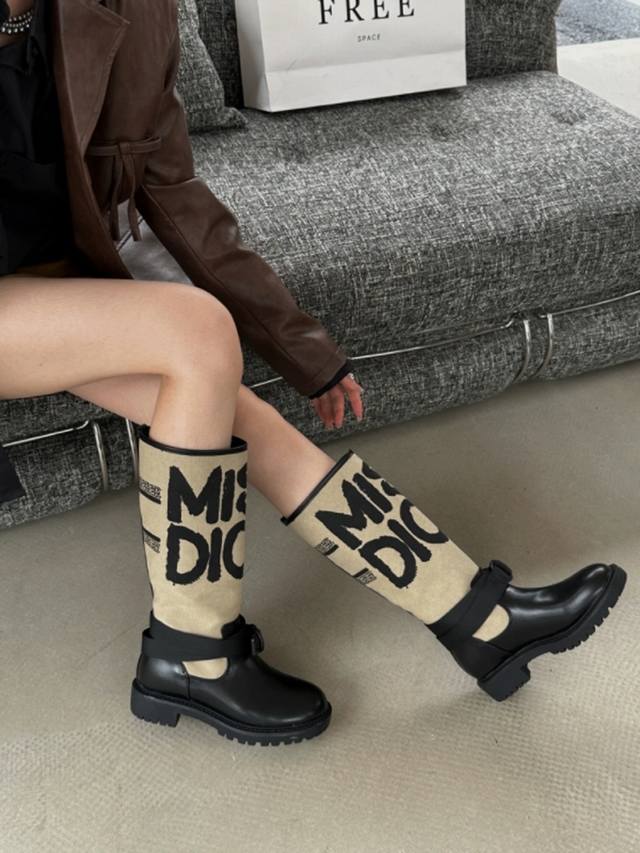 / Dior拼色 秋冬新款靴子 ,秋冬最新电绣拼色字母Logo,圆头高筒骑士女靴,明星 那尔那茜同款,易梦玲同款。 材质:头层牛皮拼接电绣面料,羊皮内里垫脚,原版开