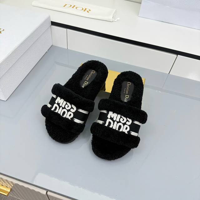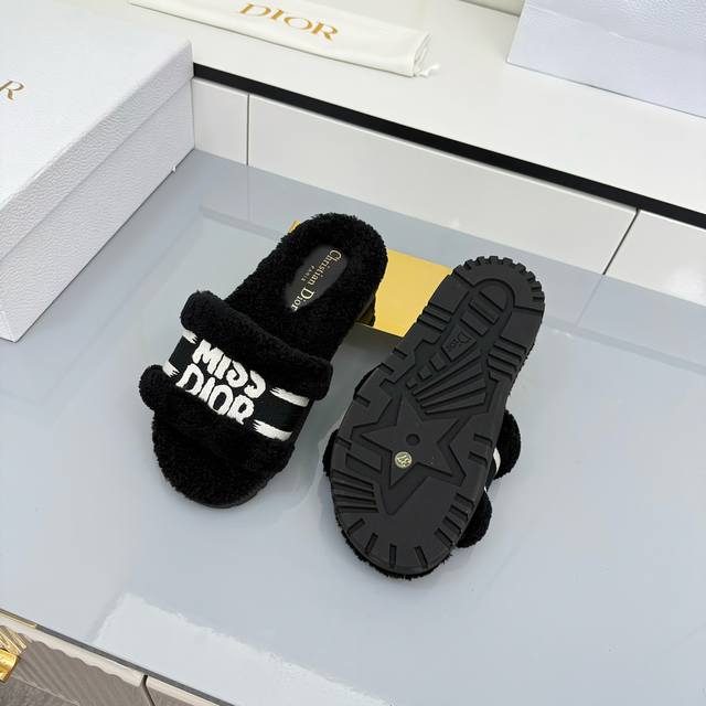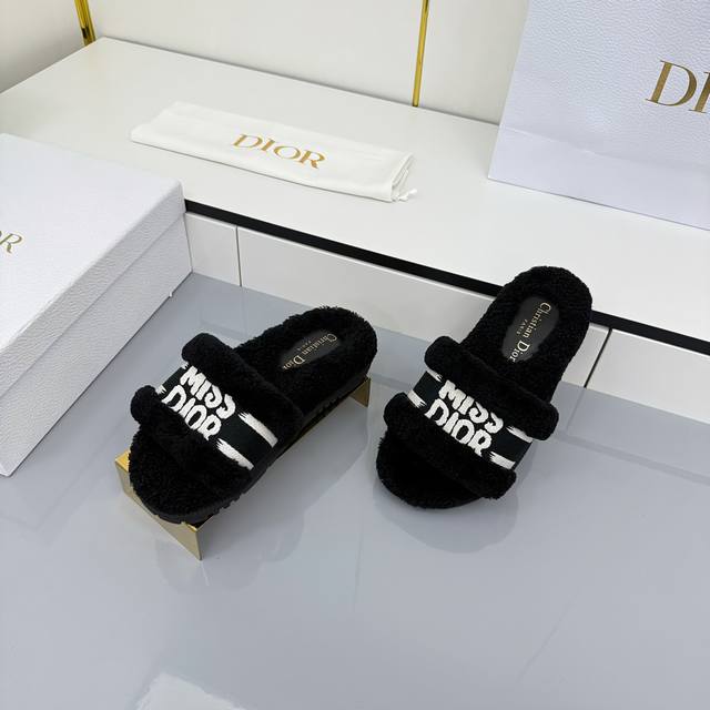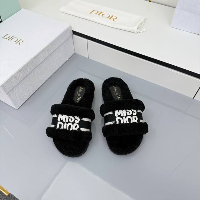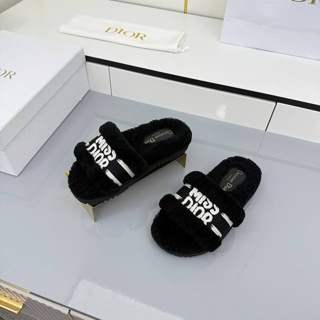 Dior毛拖全新升级版 迪奥秋冬刺绣羊毛拖鞋 软软糯糯的全真羊毛鞋面搭配刺绣,垫脚Logo采用头层打蜡牛皮,原版开模成型防滑大底,洋气百搭又舒服,俘获万千少女的心,秋冬必备单品。 Size: 35-39码 40 41 42定做码数不退不换