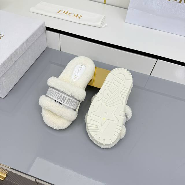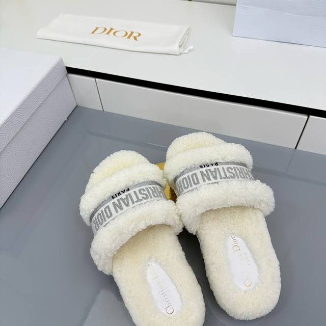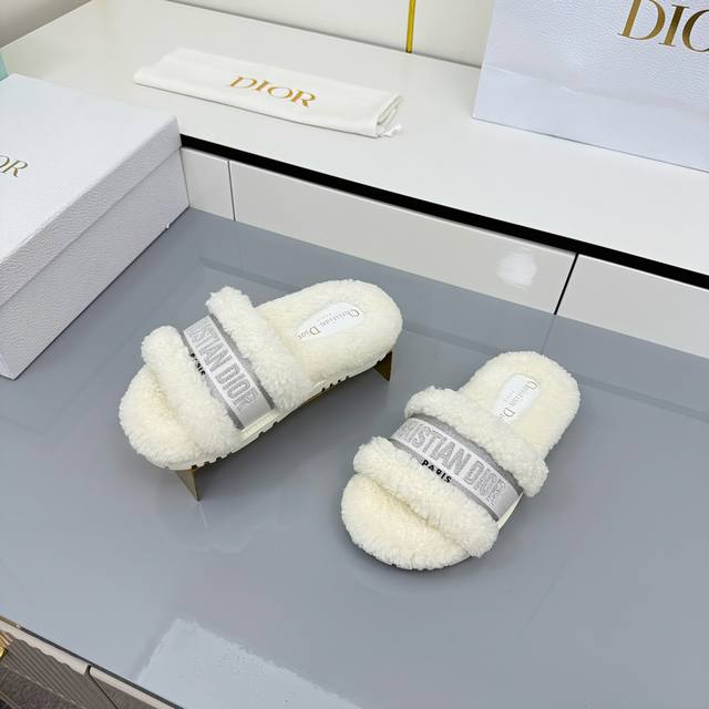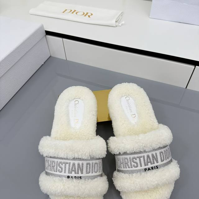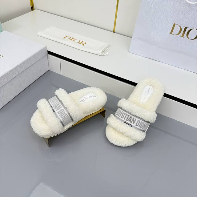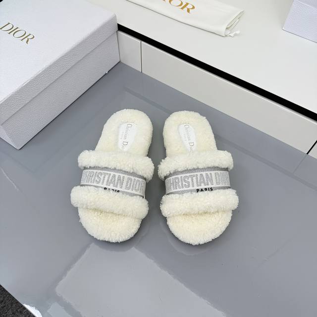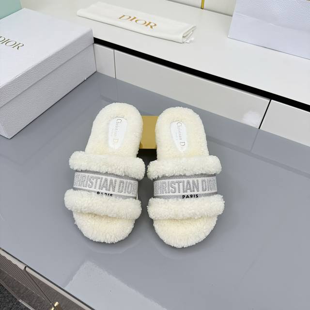 Dior毛拖全新升级版 迪奥秋冬刺绣羊毛拖鞋 软软糯糯的全真羊毛鞋面搭配刺绣,垫脚Logo采用头层打蜡牛皮,原版开模成型防滑大底,洋气百搭又舒服,俘获万千少女的心,秋冬必备单品。 Size: 35-39码 40 41 42定做码数不退不换