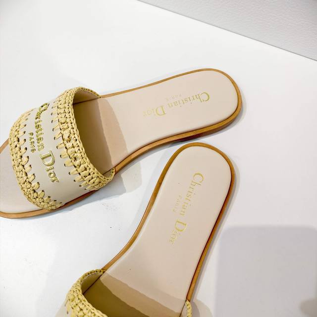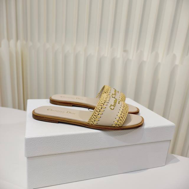 FFF Dior牛皮编织勾花平底凉拖 这款D-Lane凉拖彰显经典风格,展示镂空藤格纹图案。鞋面饰以金色金属标志,彰显时尚气质。加垫皮革内底打造舒适的穿着体验,简约设计便于穿脱,配进口真皮大底。 DDD Size:34-42码 34.40.41.42定制不退不换 DDD