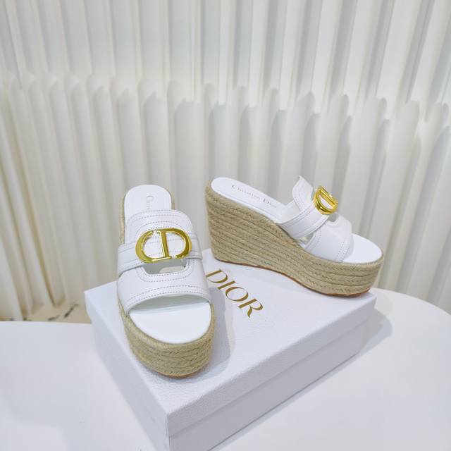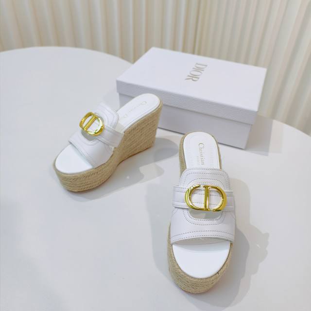 Dior秋季凉鞋抢先上D-Club镂空Cd扣编织叠层坡跟草编高跟拖鞋 这款拖鞋鞋面以及垫脚采用全皮手工制作,鞋面配以品牌经典Cd金属扣,简单舒适,适合各种脚型。即使跟高超过10Cm,穿着也是完全不累脚。大底采用耐磨防滑胶底。Size:34-43码 34.40.41.42.43定做不退不换
