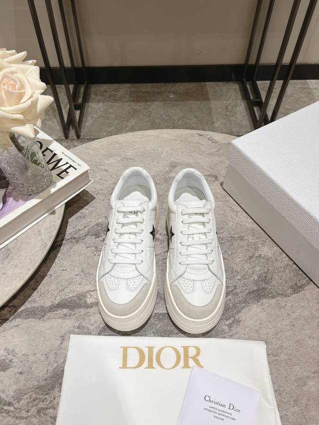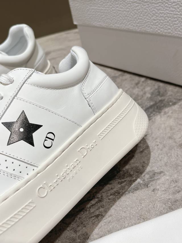 Dior迪奥 25春夏Cd松糕厚底休闲运动鞋小白鞋! 采用反绒皮和白色光滑牛皮革精心制作,侧面饰以白色五角星印花标志,鞋舌、鞋底和后侧饰以各种特色细节提升格调,