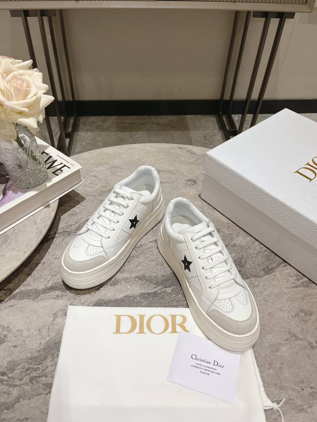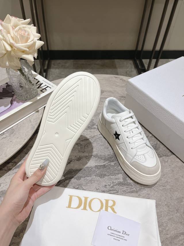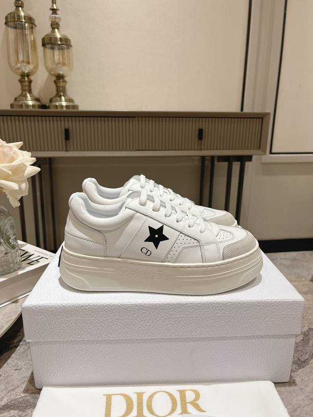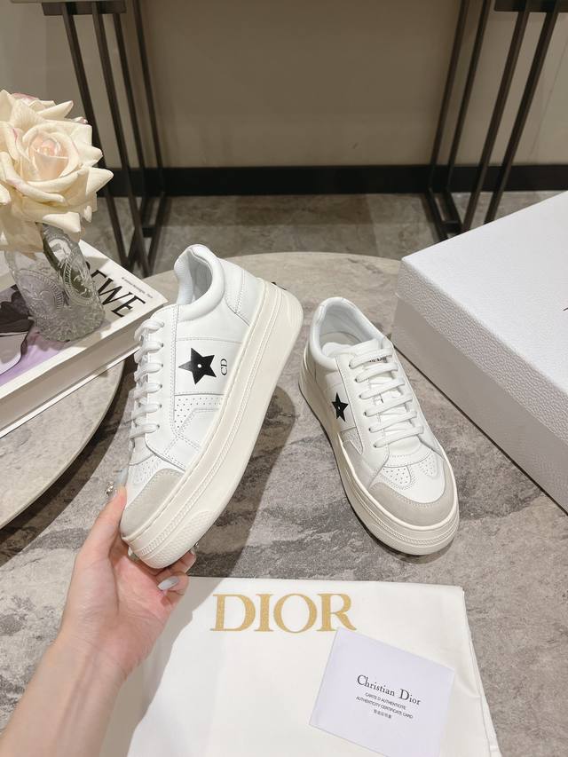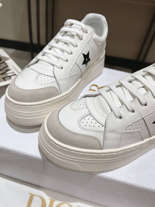 Dior迪奥 25春夏Cd松糕厚底休闲运动鞋小白鞋! 采用反绒皮和白色光滑牛皮革精心制作,侧面饰以白色五角星印花标志,鞋舌、鞋底和后侧饰以各种特色细节提升格调,而孔眼细节、缉面线和橡胶镶片更是突显其运动风格的动感魅力,可搭配各式服饰,打造精致。 鞋面采用原版定制小牛皮 内里垫脚原版进口透气布里 原版开模Lp大底 超轻盈上脚不累 底厚:约5.5Cm 码数:35-39 40.41订做不退换 配原版包装