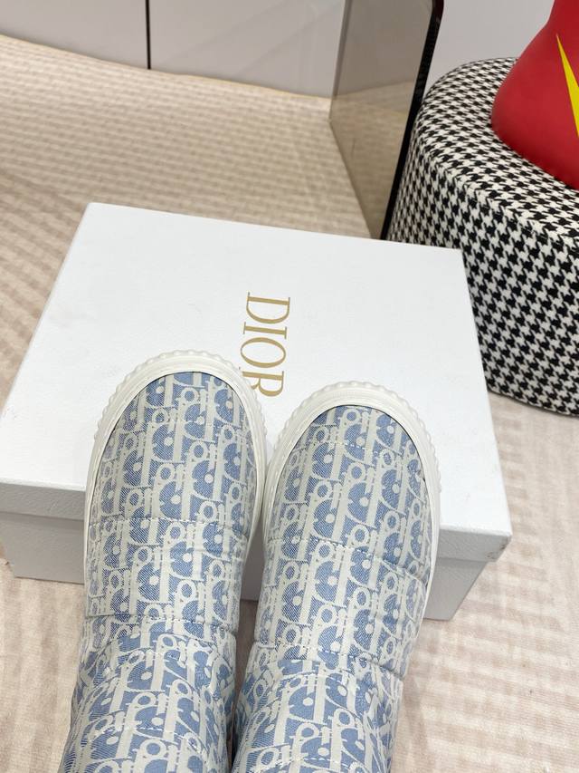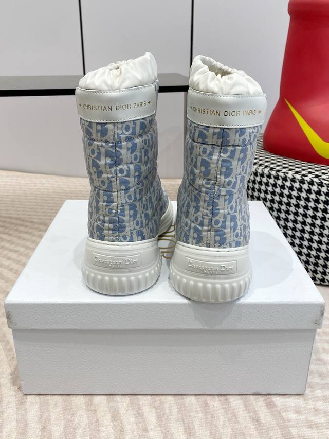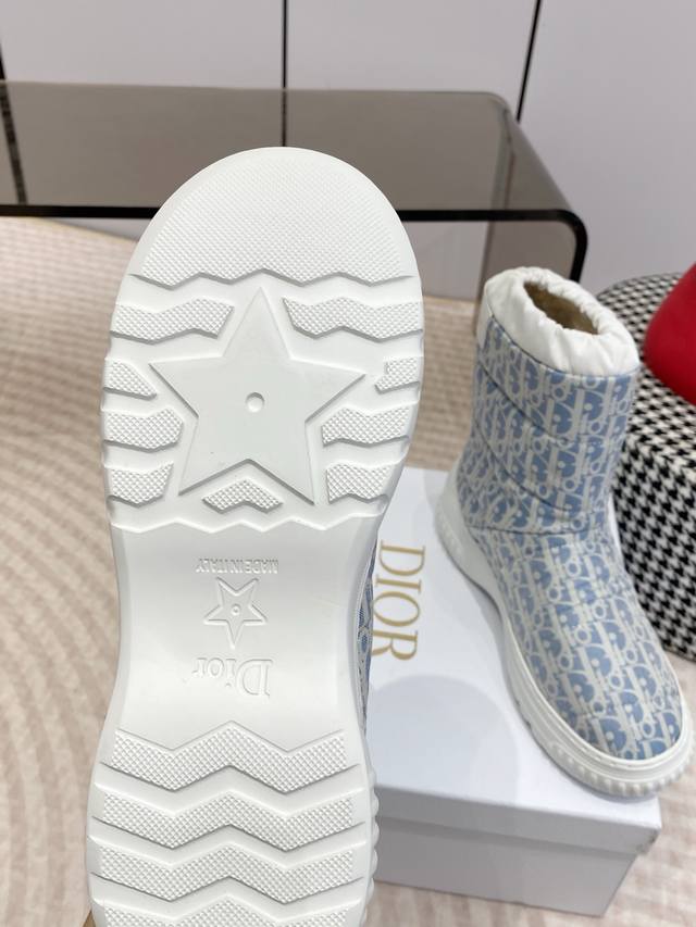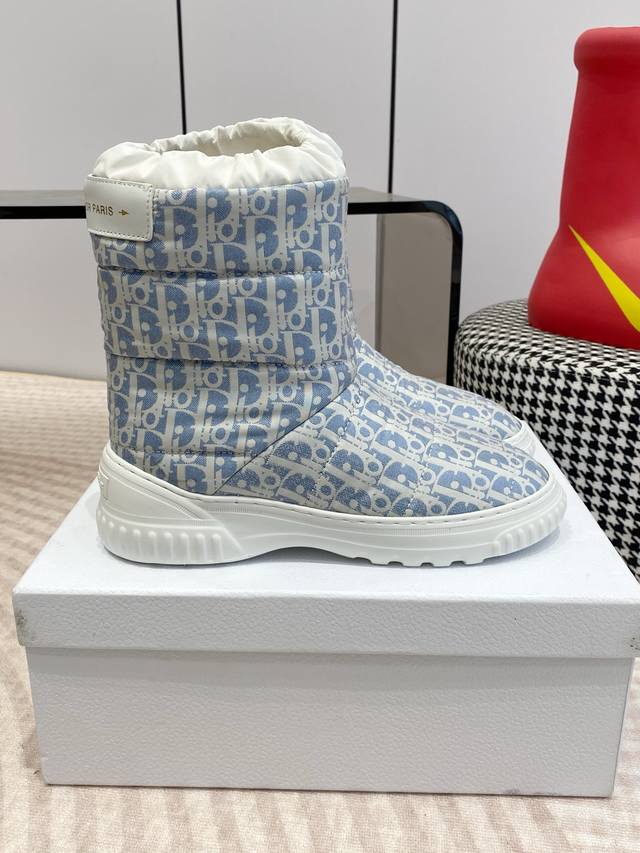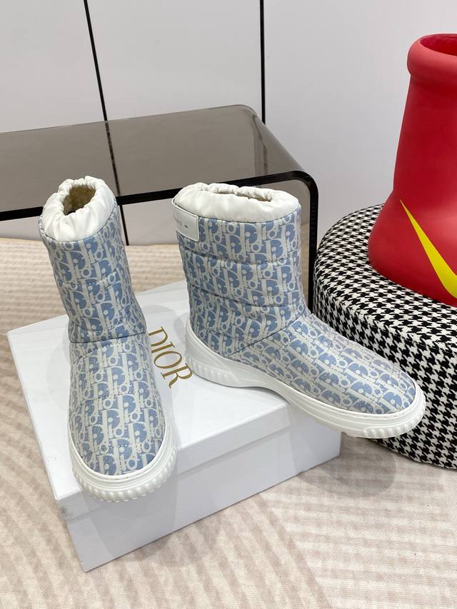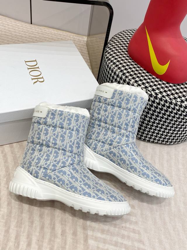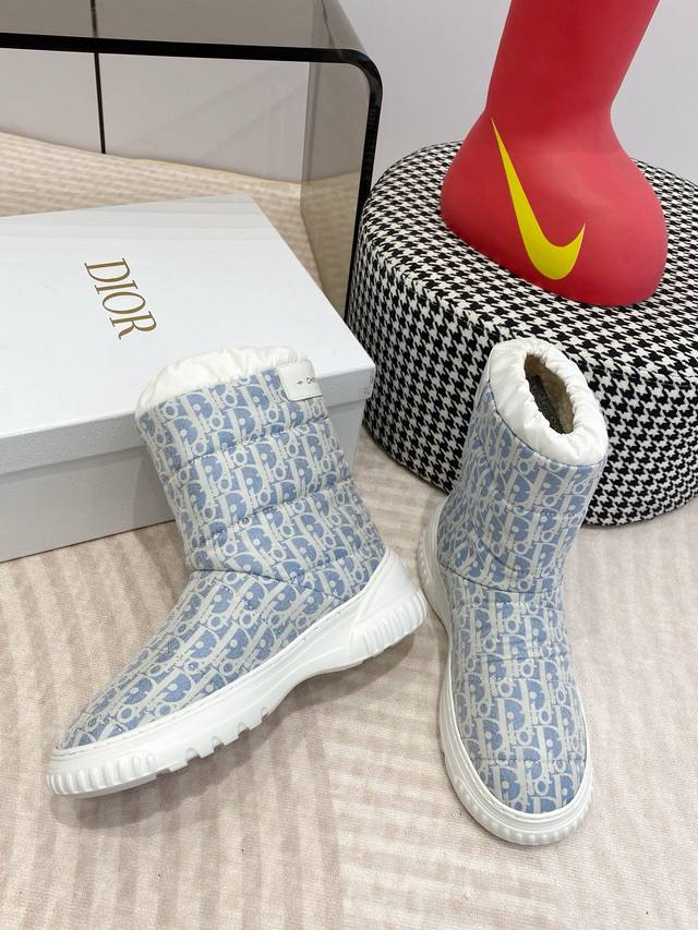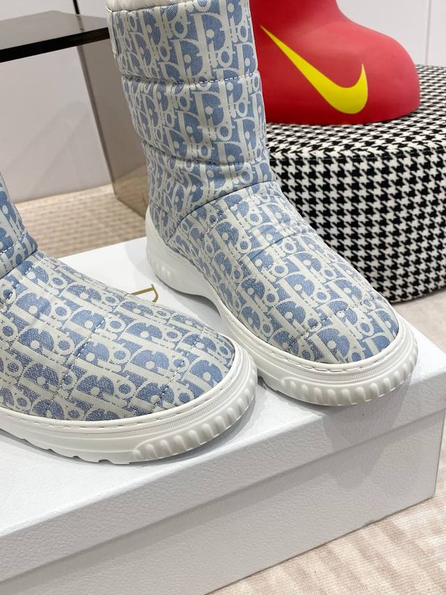 Dior迪奥 Frosr及踝靴 羊毛厚底雪地靴 DDD 这款 Dior Frost 及踝靴来自 Dior Alps 限定系列,融入高订风格,重新诠释雪地靴款式 DDD 水洗蓝和米白色绗缝效果锦纶 Oblique 印花鞋面,与白色羊皮革皮毛一体效果内部相得益彰,弹力设计可打造理想的贴合度。后侧饰以同色调皮革镶片,点缀以金色调 Christian Dior paris 标志,轻盈的橡胶鞋底饰以徽标,更显精致。可与其他 Dioralps 单品搭配,打造配套造型。 DDD 面料:原版定制老花面料 里料:100%羊