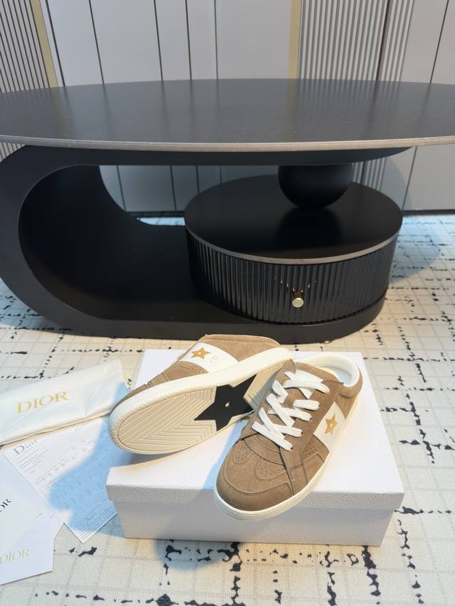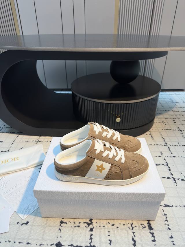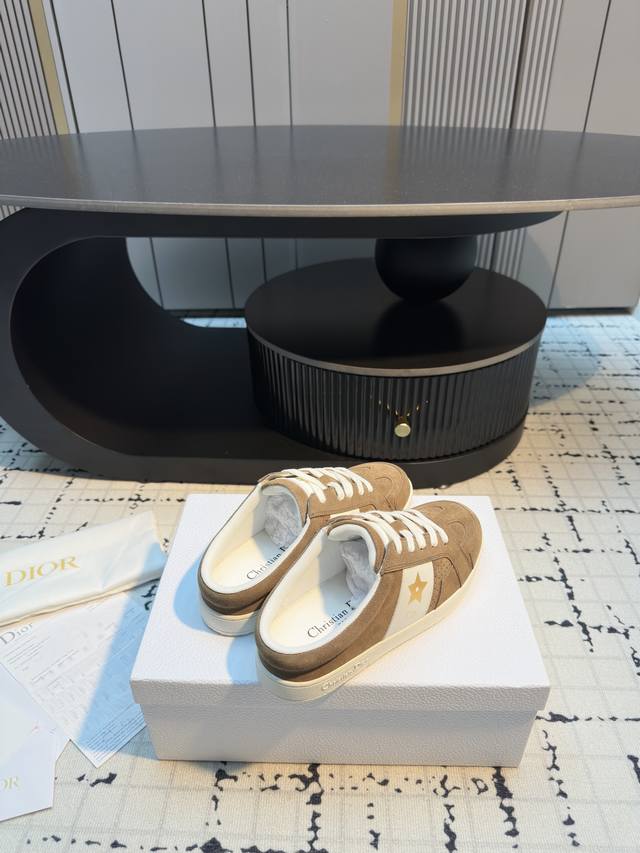 / Dior迪奥25春夏半拖小白鞋 采用白色光滑牛皮革精心制作,侧面饰以白色五角星 印花标志,鞋舌、鞋底和后侧饰以各种特色细节提升格调,而孔眼细节、缉面线和橡胶镶片