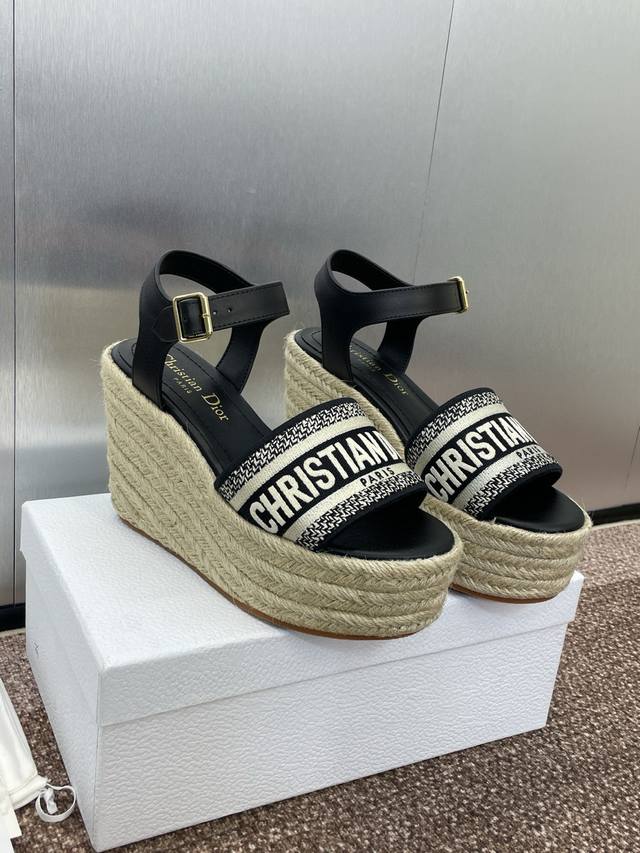 cd字母Logo立体刺绣草编坡跟圆头露趾凉鞋