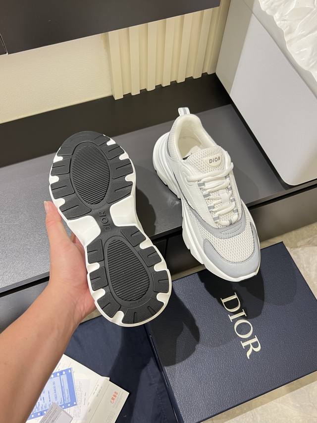 Dior B22复古慢跑鞋,灵感来自经典慢跑鞋,低帮厚底设计,牛皮革+网眼织物拼接,质感满分又透气。 黑白刻花橡胶鞋底,抓地力和舒适度都很棒,日常穿搭或运动都O