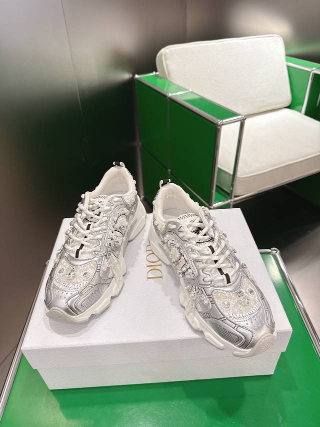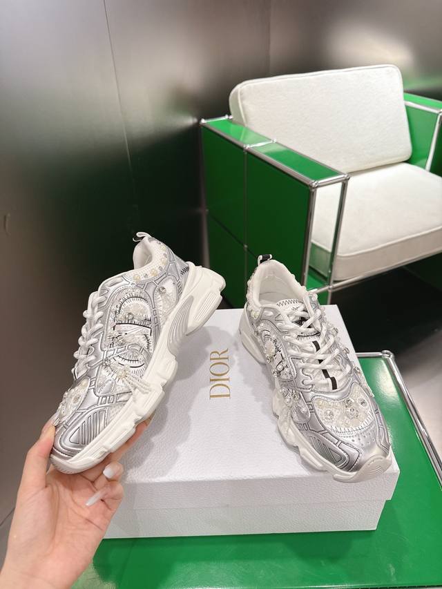 / K020 Dior 迪奥Dior Vibe 运动鞋 这款 Dior Chrono 运动鞋以 Dior 的高订风格重新演绎跑步鞋。网眼织物搭配白色皮革效果镶片,两
