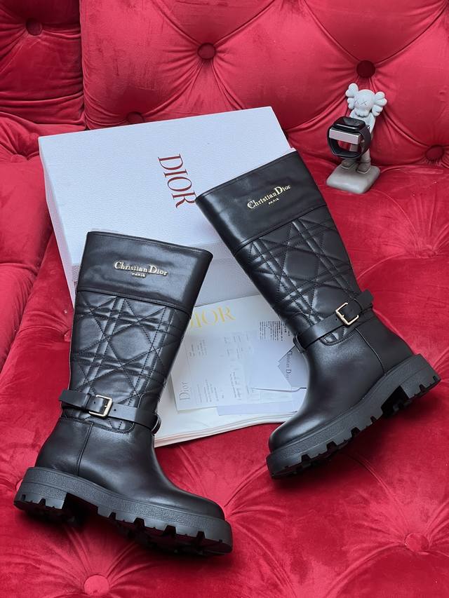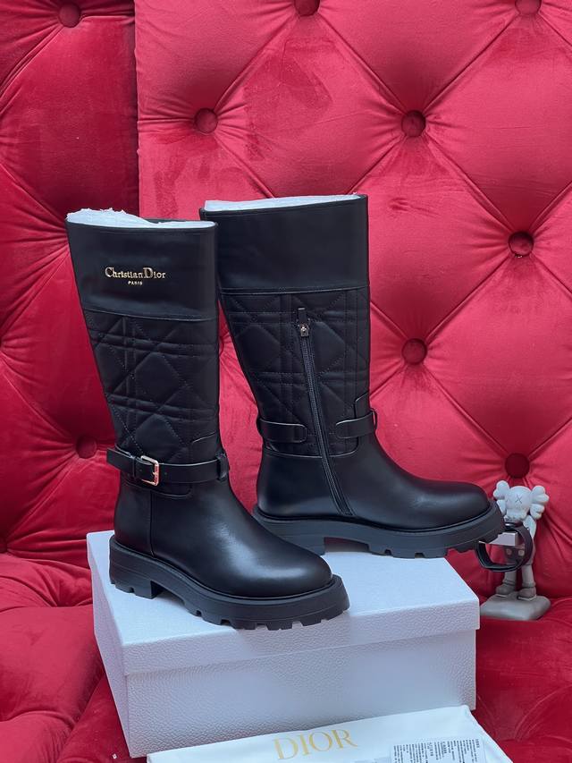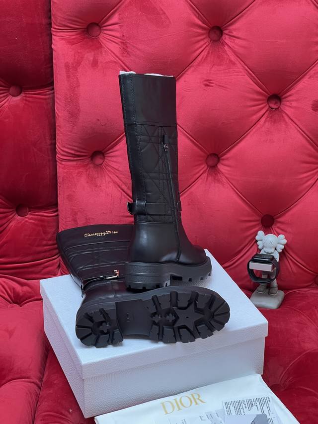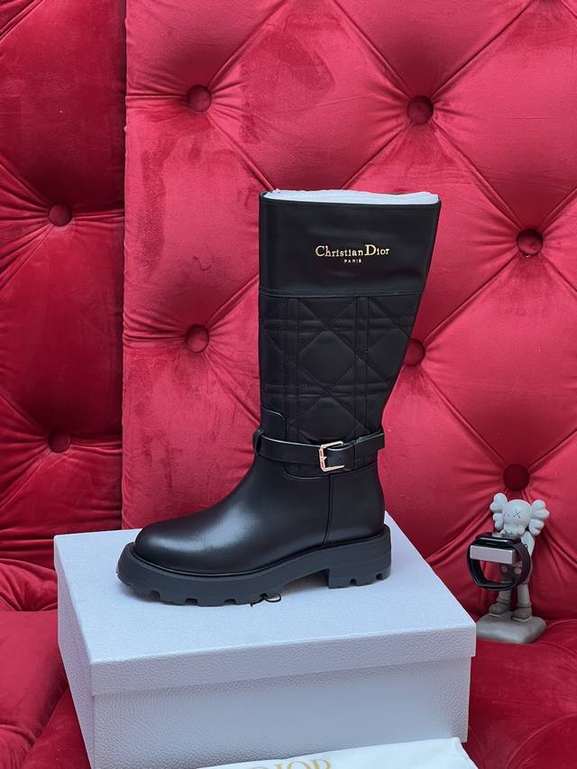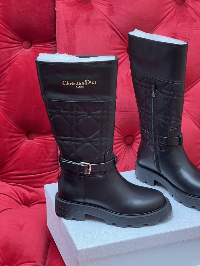 / p布面 全皮 独家实拍 顶级版本 Dior 迪奥2026Ss秋冬新款D-Quest系列朋克风藤格纹电绣女靴 明星同款Cd字母Logo五金皮带扣机车靴 低跟厚底圆