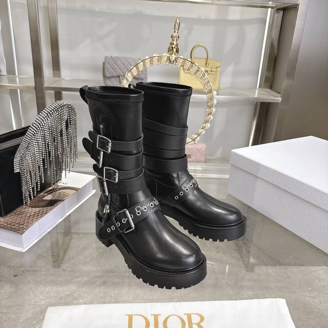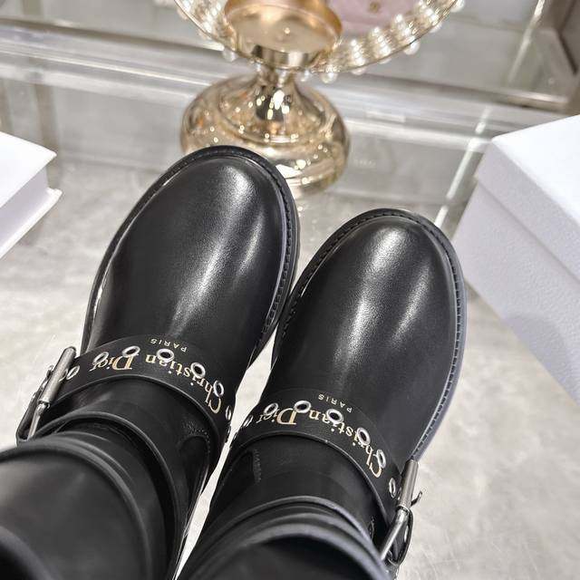出厂 代购级 Dior 迪奥 25新款 中靴 高筒靴 布洛克长靴 25早春成衣系列新品,彰显高订魅力。黑色橡胶效果牛皮革筒形设计,侧面饰以银色拉链饰面提升格调。搭配厚实而轻盈的凹口鞋底,可为本季休闲造型增光添彩。 鞋面小牛皮材质牛皮内里, 跟高:4.5Cm 原版开模 Tpu 大底 Size:35-41 40 41定做不退换