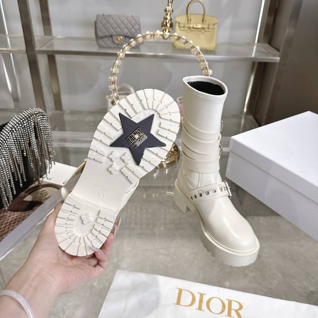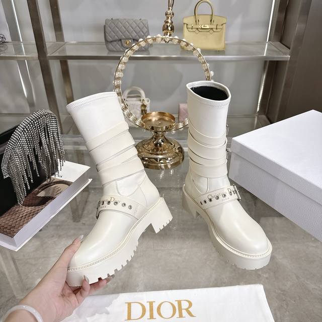 出厂 代购级 Dior 迪奥 25新款 中靴 高筒靴 布洛克长靴 25早春成衣系列新品,彰显高订魅力。黑色橡胶效果牛皮革筒形设计,侧面饰以银色拉链饰面提升格调。搭配厚实而轻盈的凹口鞋底,可为本季休闲造型增光添彩。 鞋面小牛皮材质牛皮内里, 跟高:4.5Cm 原版开模 Tpu 大底 Size:35-41 40 41定做不退换