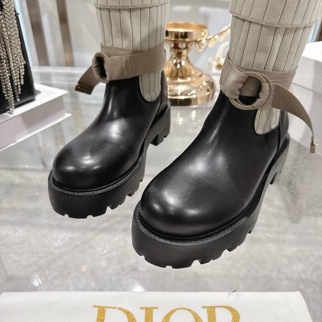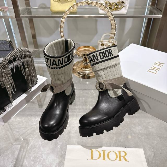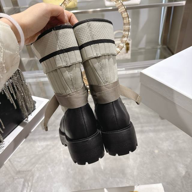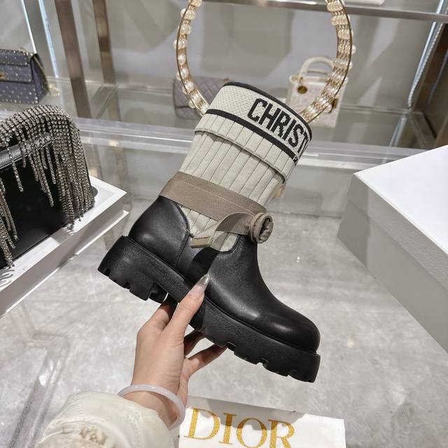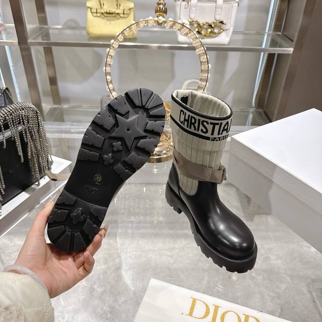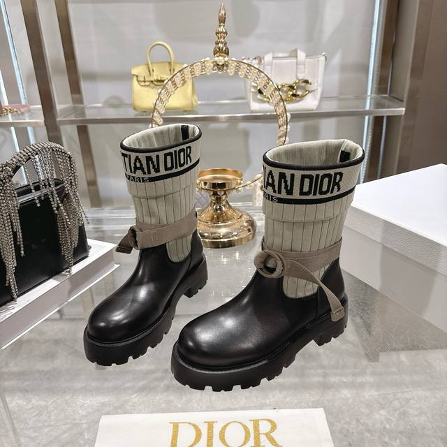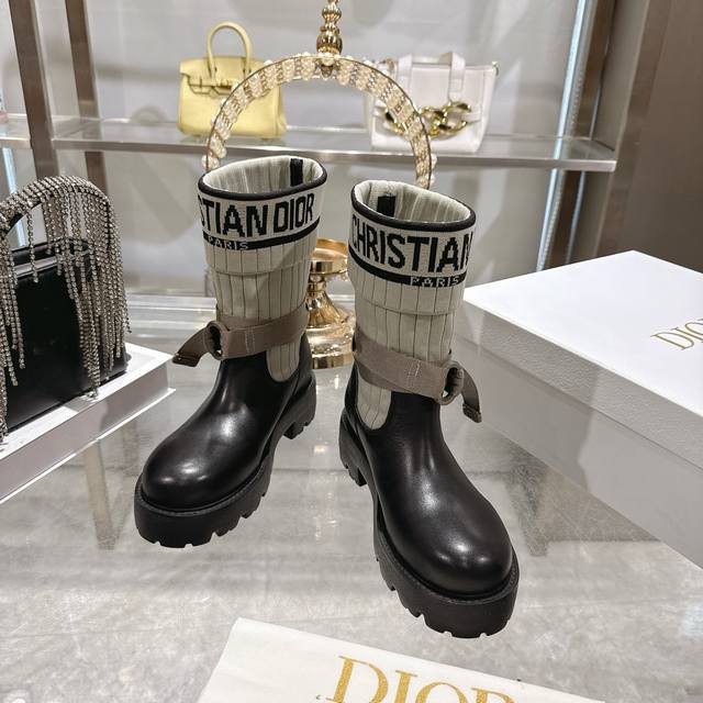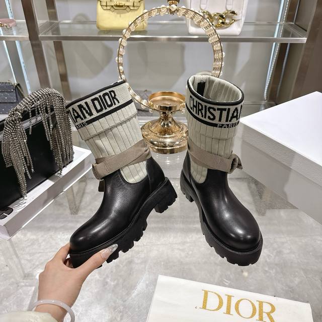 出厂 Dior 迪奥新款袜子靴短靴弹力长筒靴 DDD 鞋身结合了皮革靴底与针织袜筒,皮革部分挺括有型,针织袜筒则增添柔软弹性,兼具帅气与舒适感。袜筒上方印有醒目的“Christian Dior paris”白色字母织带,强化品牌辨识度,成为造型的视觉焦点。 DDD 靴身配有搭扣式绑带,既提升实用性,又为整体增添工装风的硬朗细节;厚底设计则兼具增高效果与复古质感。这款靴款的百搭性较强,可根据不同风格需求,灵活组合服饰与配饰,轻松适配日常出街、派对或轻职场等多种场景。 DDD 鞋面:牛皮 弹力袜 DDD 内里