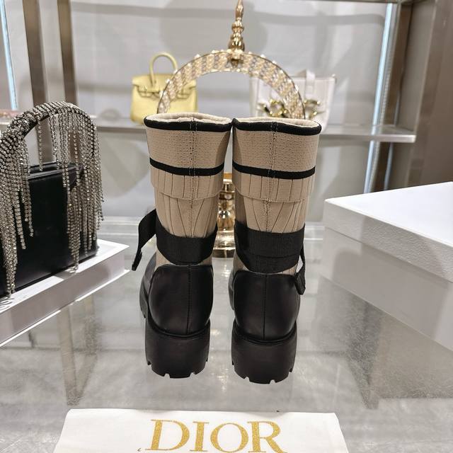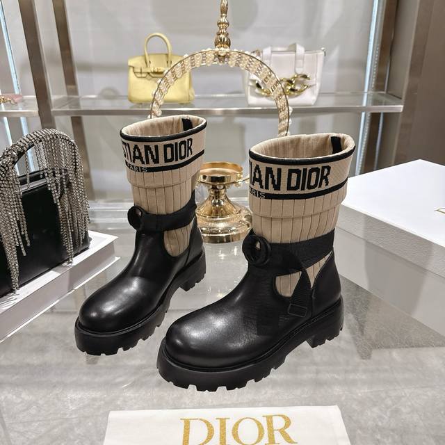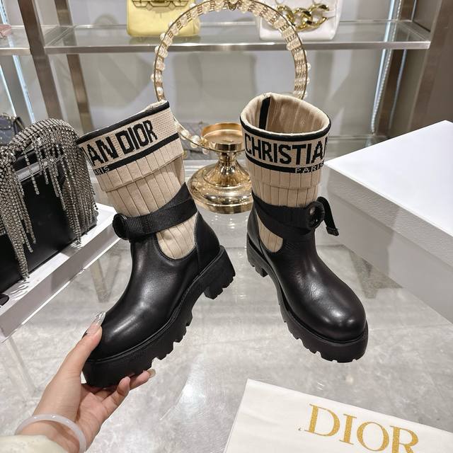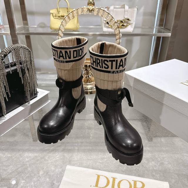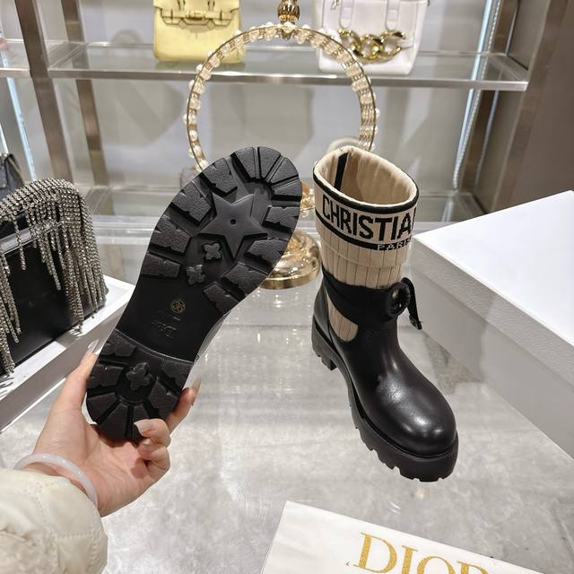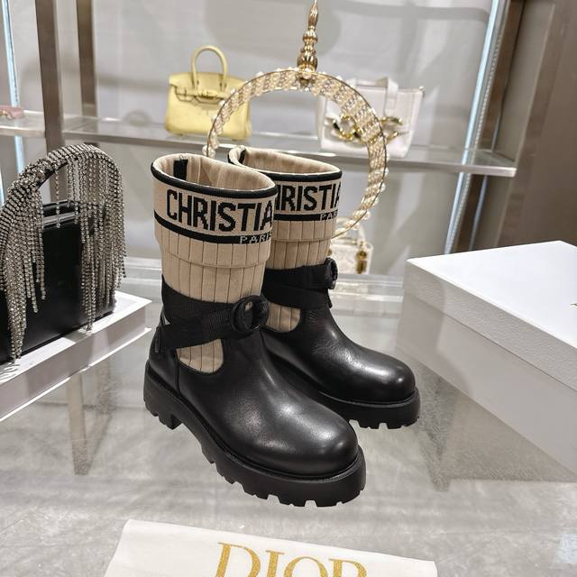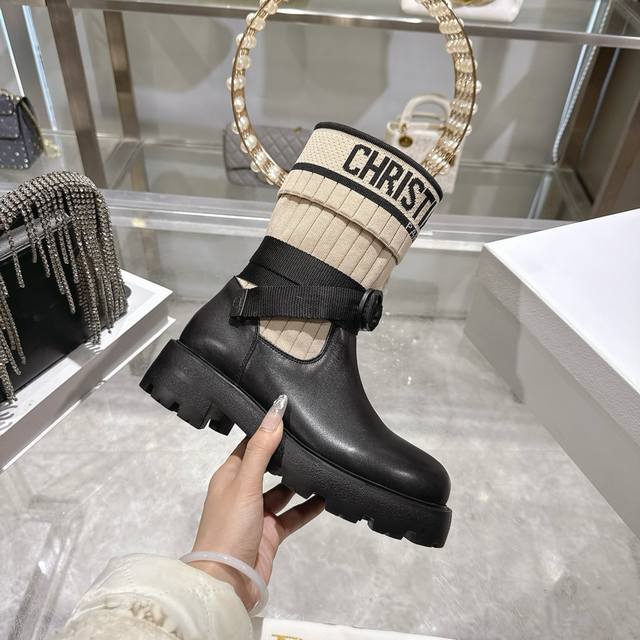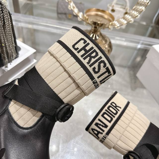 出厂 Dior 迪奥新款袜子靴短靴弹力长筒靴 鞋身结合了皮革靴底与针织袜筒,皮革部分挺括有型,针织袜筒则增添柔软弹性,兼具帅气与舒适感。袜筒上方印有醒目的“Ch