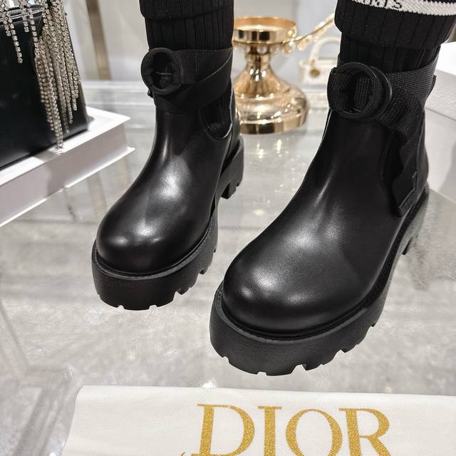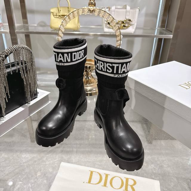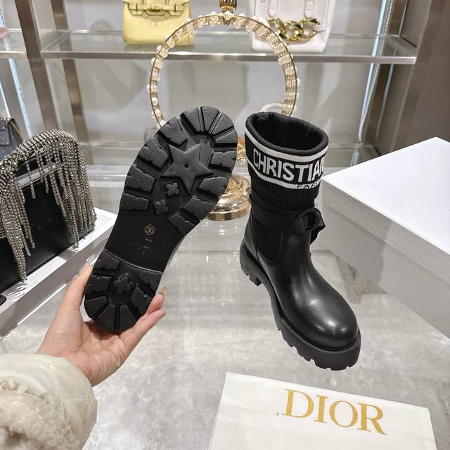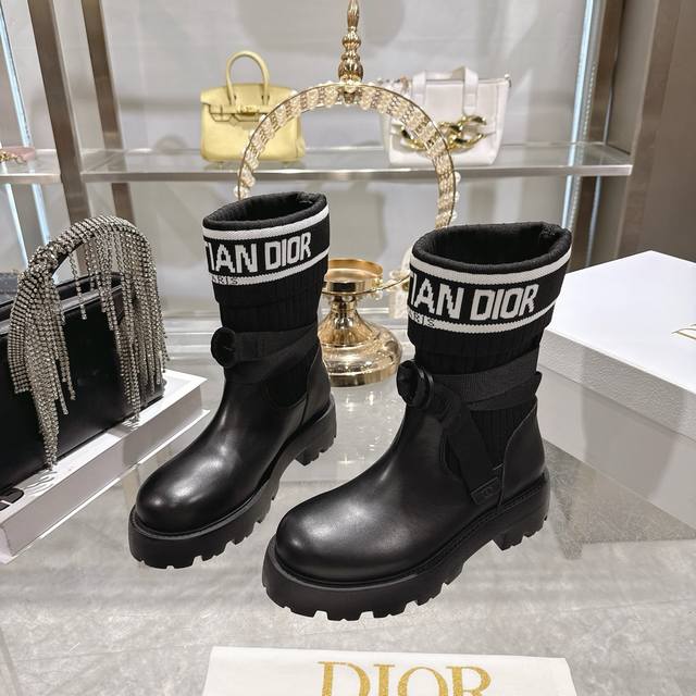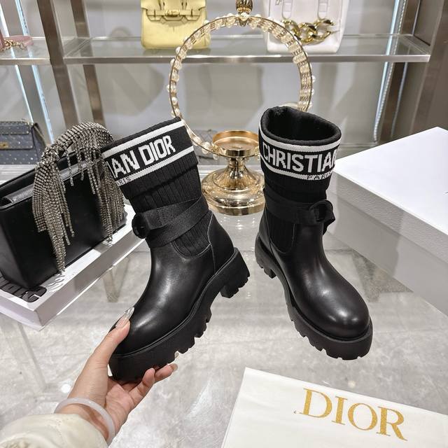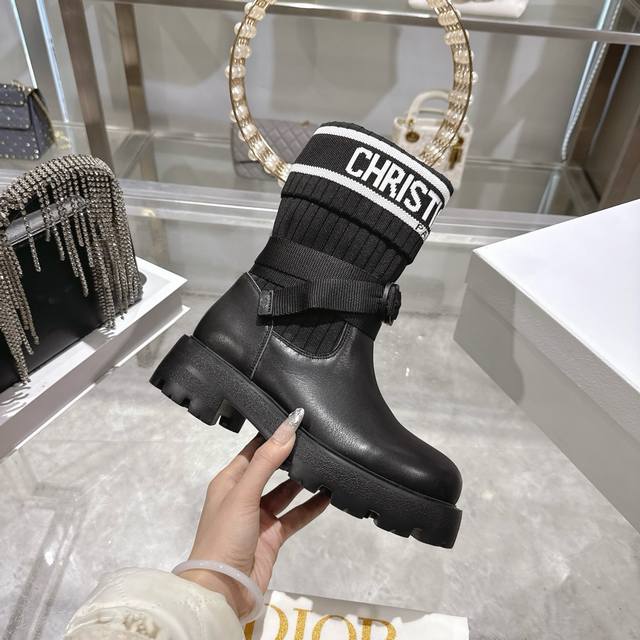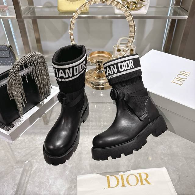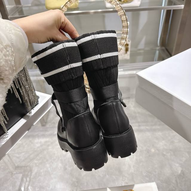出厂 Dior 迪奥新款袜子靴短靴弹力长筒靴 鞋身结合了皮革靴底与针织袜筒,皮革部分挺括有型,针织袜筒则增添柔软弹性,兼具帅气与舒适感。袜筒上方印有醒目的“Ch