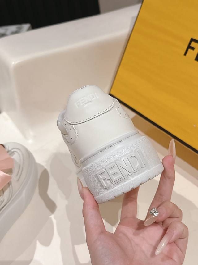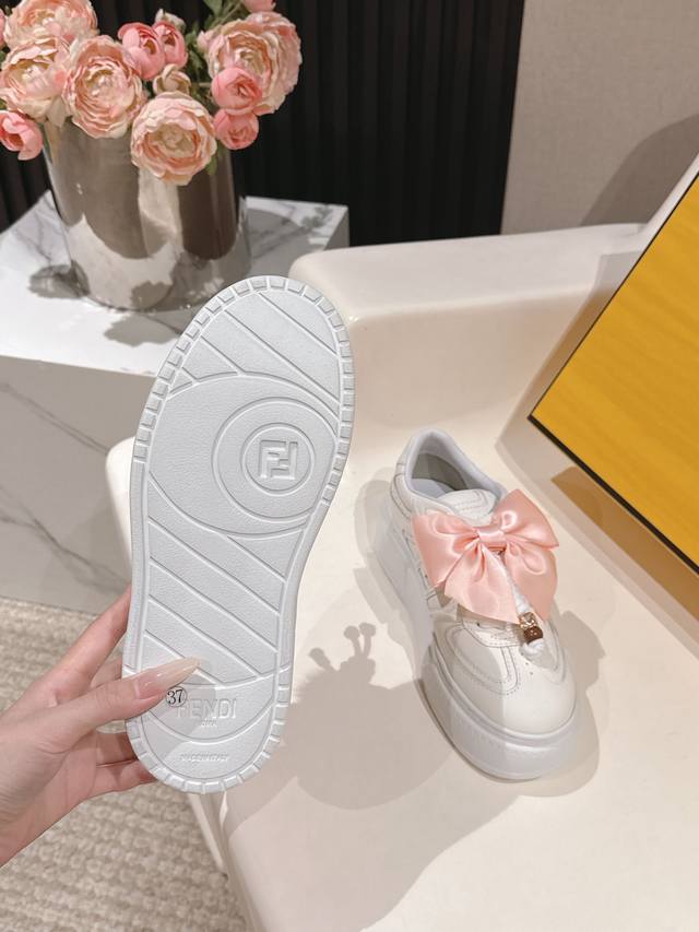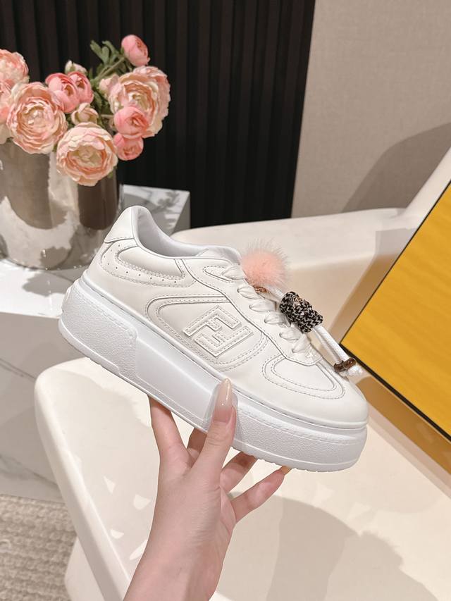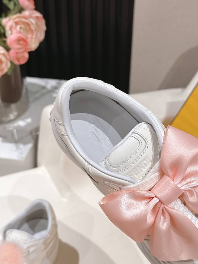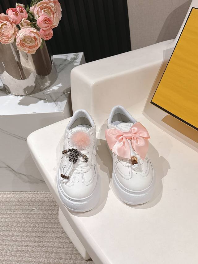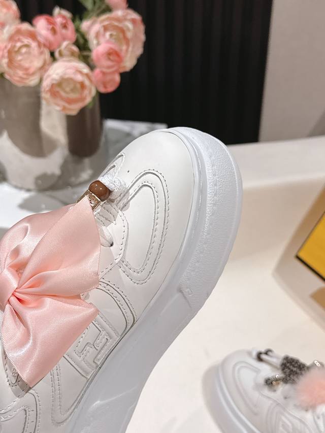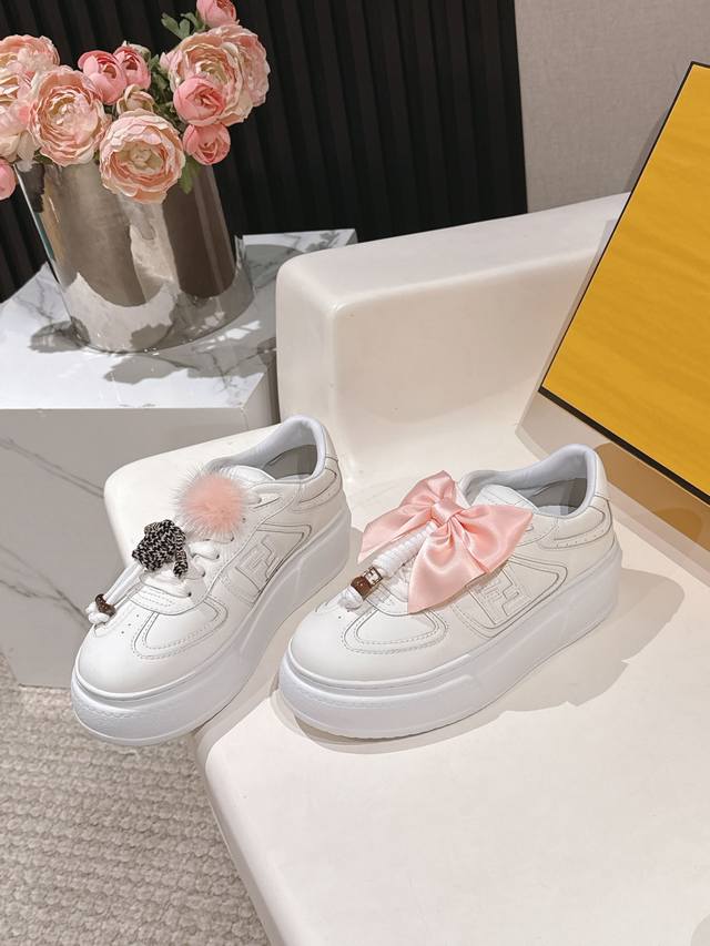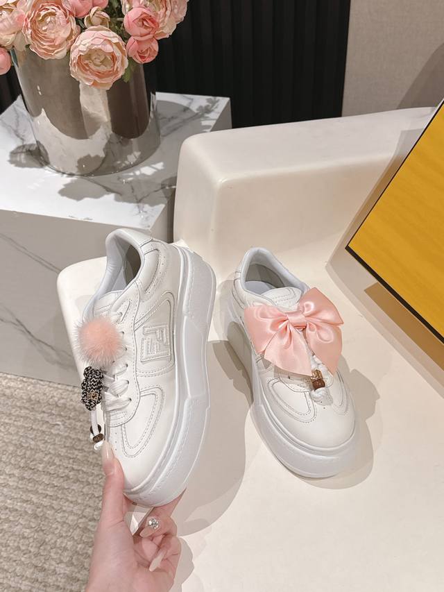 全白皮面 芬迪 Fendi 最新款Match的不对称魔法厚底Charm Match系带运动鞋 皮面.牛仔面料效果印花绒面材质。右鞋上饰有带彩色和彩色貂毛细节和金色金属Ff图案手链的编绳小玩偶。左鞋上饰有棕色塔夫绸大蝴蝶结。这种“一半童趣、一半优雅”的反差设计,既 奇奇怪怪 左右风格打架却超和谐 ,又 可可爱爱 细节里的萌点和精致感拉满 ,妥妥把厚底鞋玩出艺术感 原版牛仔面 全牛皮面 羊皮内里 Ip大底5Cm 35-41 DDD