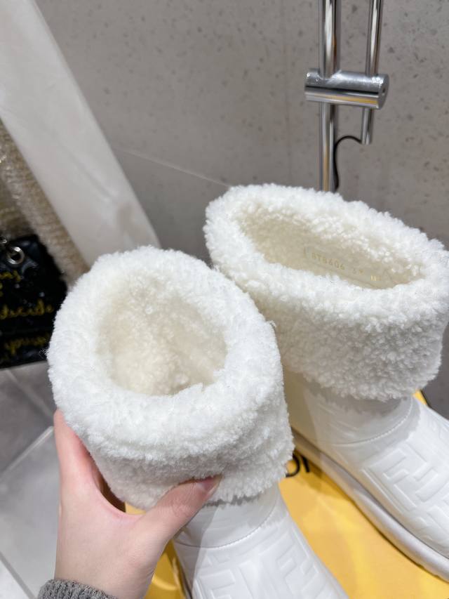 出厂:绒面 皮面 Fendi 芬迪 F家秋冬新款羊毛雪地靴 纯皮毛一体羊毛材质!萌萌哒~暖暖哒~ 鞋底高密度发泡材质轻软弹性,脚感无比轻盈, 靴身双F经典压花