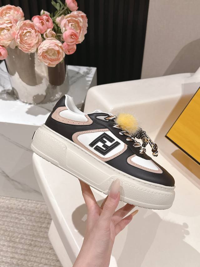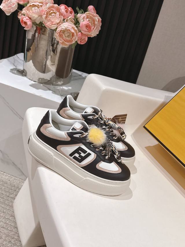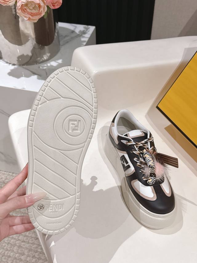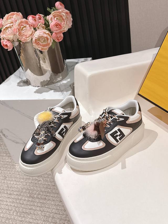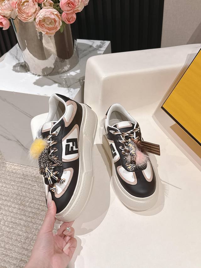 出 全白皮面 芬迪 Fendi 最新款Match的不对称魔法厚底Charm Match系带运动鞋 皮面.牛仔面料效果印花绒面材质。右鞋上饰有带彩色和彩色貂毛细节和金色金属Ff图案手链的编绳小玩偶。左鞋上饰有棕色塔夫绸大蝴蝶结。这种“一半童趣、一半优雅”的反差设计,既 奇奇怪怪 左右风格打架却超和谐 ,又 可可爱爱 细节里的萌点和精致感拉满 ,妥妥把厚底鞋玩出艺术感 原版牛仔面 全牛皮面 羊皮内里 Ip大底5Cm 35-41 DDD