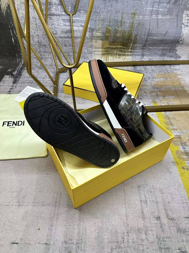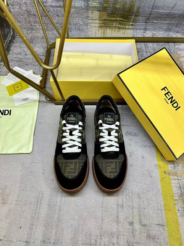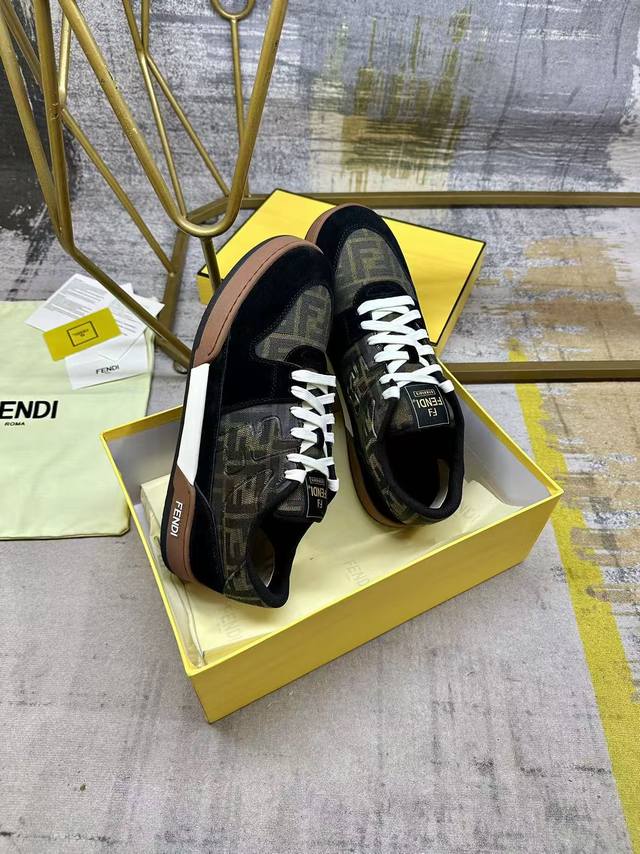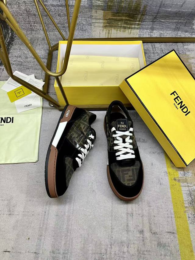 升级版本Fendi Match系带最新运动鞋,点缀棕色和烟草黄提花Ff布料材质饰有黑色麂皮细节,注塑Ff贴花装饰,男码39-45码 DDD
