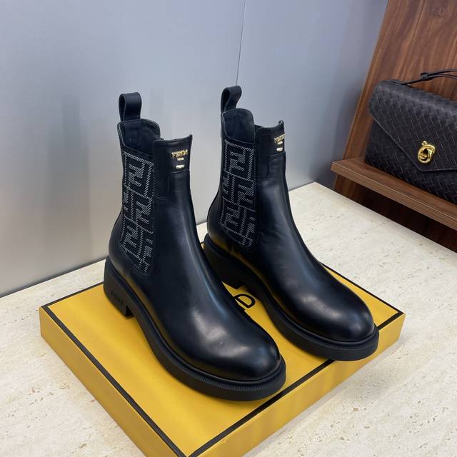 / 工厂p价p Fendi 2025秋冬新款切尔西弹力机车女短靴 芬迪字母Logo五金扣厚底低跟圆头骑士军靴 材质:鞋面进口小牛皮+水染牛皮内里+原版开模防滑Tpu