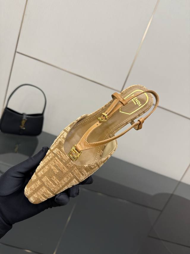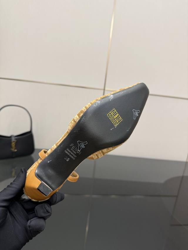 新款芬迪 Ffold方头雪尼尔露跟高跟鞋凉鞋 方头露跟鞋,鞋面选用原版优质进口雪尼尔面料配有缠脚鞋带。金属Ff饰扣细节,中央加入功能性铰链的特殊设计,舒适、美观