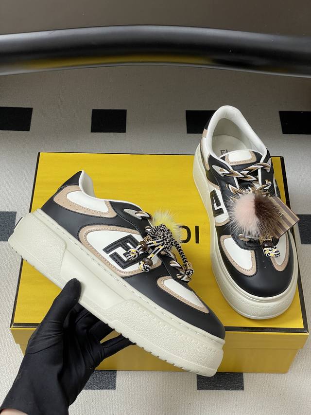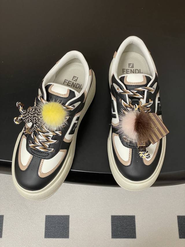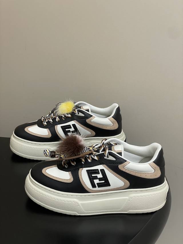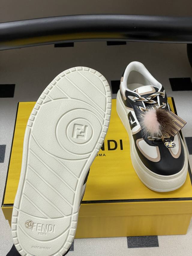 顶级品质 DDD Fendi芬迪 Match系列 25最新配色 吊饰厚底板鞋系带休闲运动鞋 DDD Fendi Match系带运动鞋。浅粉色皮革材质,带白色和赭石棕细节。侧边饰有撞色皮革Ff贴花,白色、粉红色和赭石棕登山鞋带。橡胶厚鞋底,后跟处饰有超大凸纹压花Fendi字样。鞋舌上饰有金属环挂饰:右鞋上饰有带撞色貂毛细节和金色金属Ff手链的编绳小玩偶。左鞋上饰有一条带撞色貂毛双绒球的编绳,饰有金属Ff圆珠,以及 pequin印花图案和标志。 DDD 鞋面:原版定制进口头层牛皮 DDD 内里:进口定制透气网