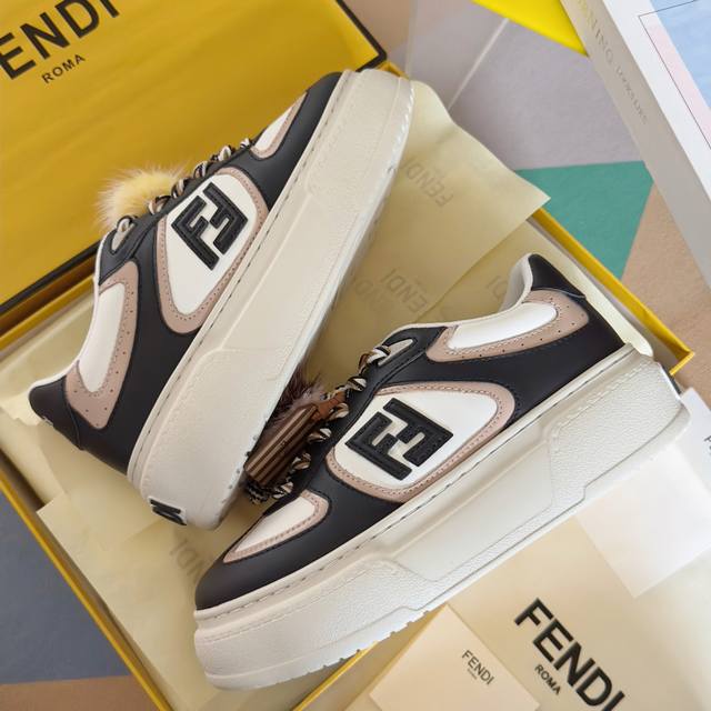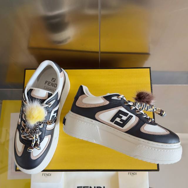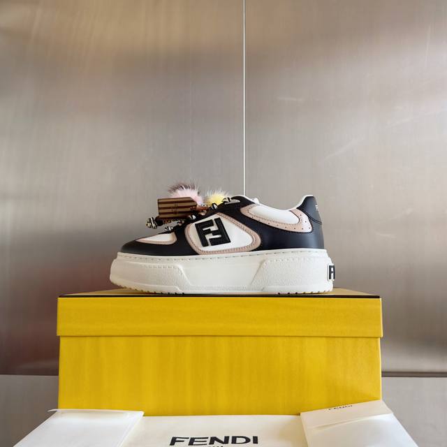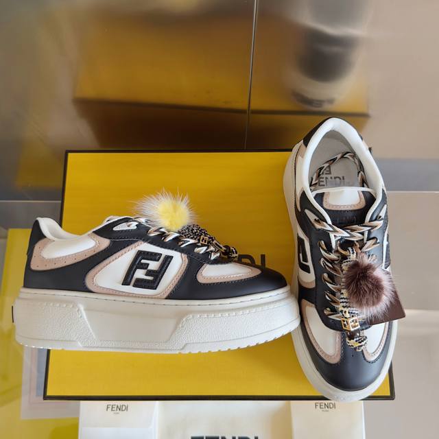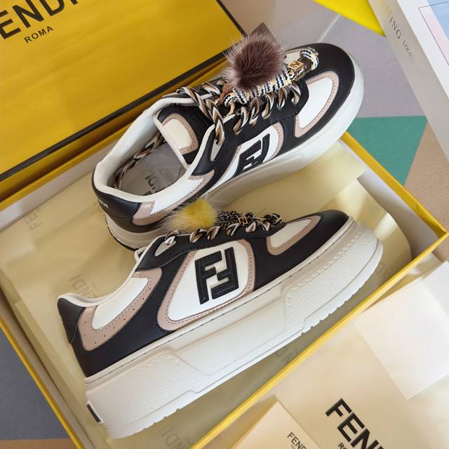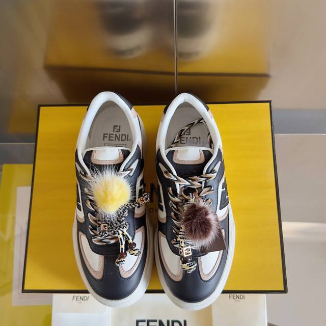 顶级版本:女款 DDD Fendi芬迪 厚底Match系列 小玩偶 休闲 运动鞋 DDD 原版购入开发 做货 原版购入开发 做货 这款Fendi Match系带运动鞋。白色皮革材质,带米色细节。侧边饰有撞色皮革Ff贴花,白色、米色和棕色登山鞋带。橡胶厚鞋底,后跟处饰有超大凸纹压花Fendi字样。鞋舌上饰有金属环挂饰:右鞋上饰有带撞色貂毛细节和金色金属Ff图案手链的编绳小玩偶。左鞋上饰有一条带撞色貂毛双绒球的编绳,饰有金属Ff圆珠,以及pequin印花图案和标志 DDD 配送专柜精美包装 DDD 面料:原版