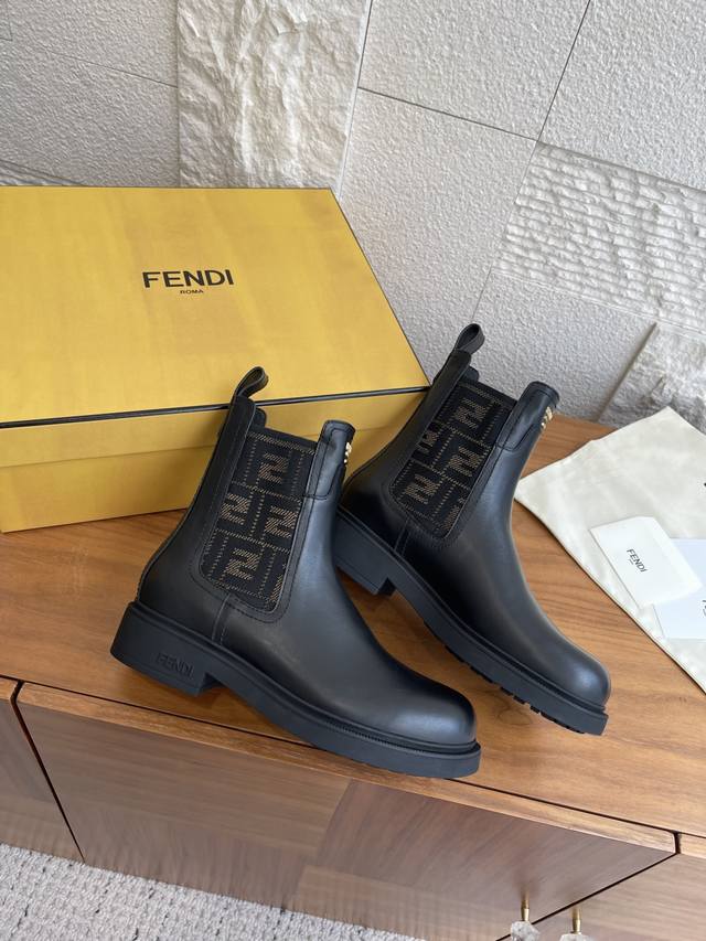 / 顶级版本: 莞货 Fendi 芬迪 2025 早秋新款 Filo 黑色皮革和Ff布料机车靴 Fendi Filo机车靴,圆头,侧面有松紧嵌饰。黑色皮革材质,饰有