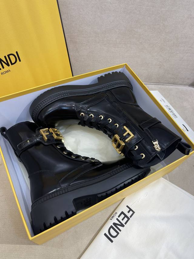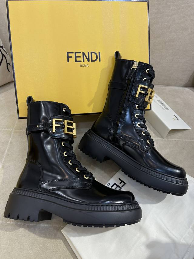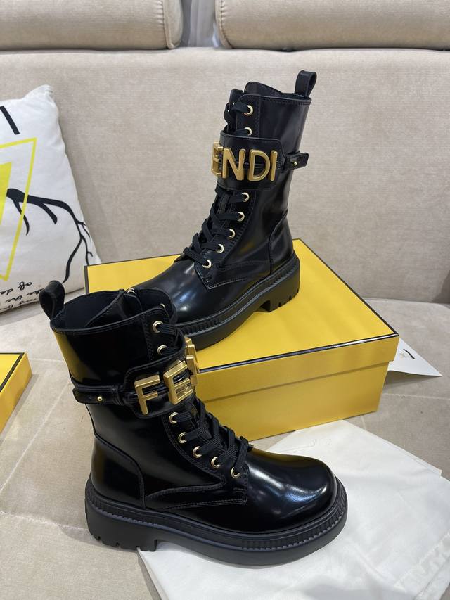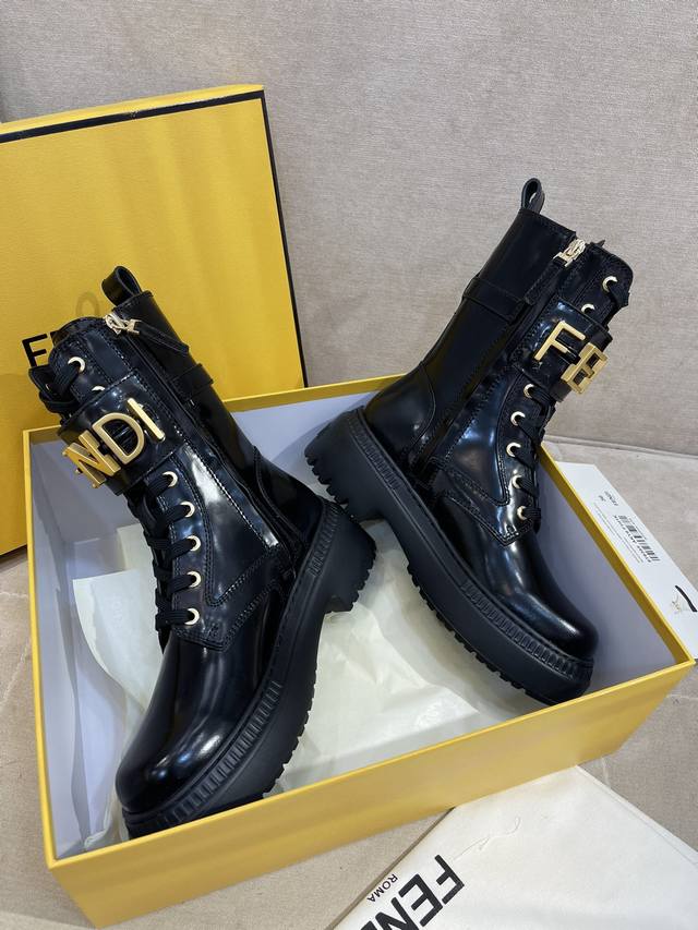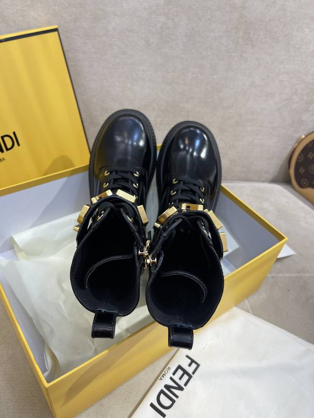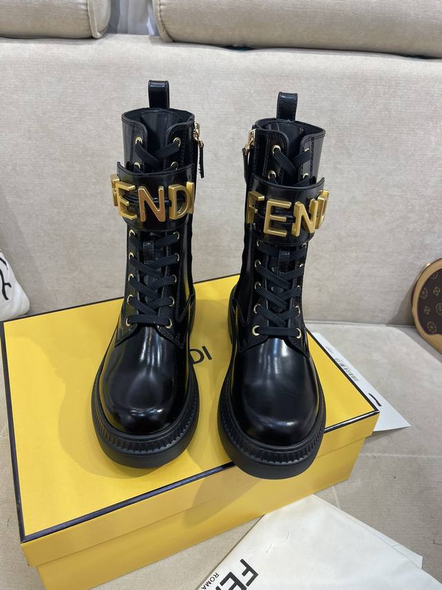 顶级版本Fendi 芬迪秋冬最新马丁靴 原版高端定制 Fendigraphy马丁靴以抛光亮面牛油皮制作,风格经久不衰,系带系统稳固安全,可轻松搭配秋冬着装,这款马丁靴搭配金色Fendi金属配饰、孔眼和拉链开合,高级感感满满 机车造型时尚前卫,更待一抹女性柔美魅力。原版Logo五金扣 DDD 面料:进口牛油皮 DDD 内里:牛皮内里 DDD 原版真皮加Ip发泡组合大底 DDD 码数:35-40 DDD