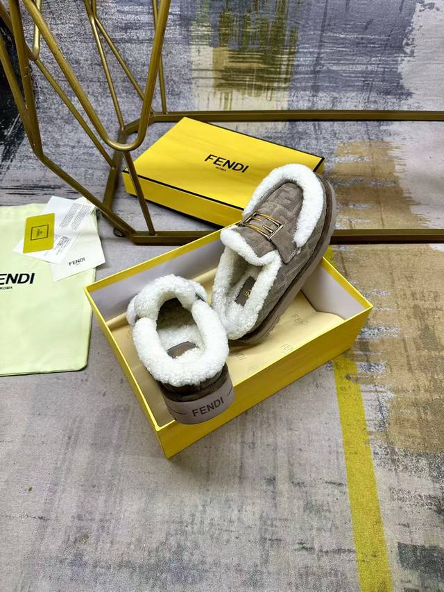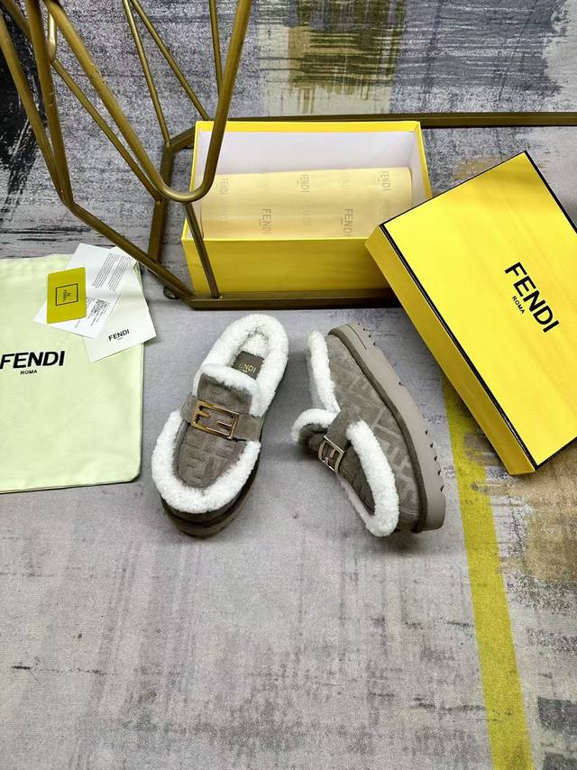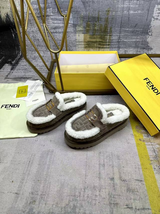 Fendi最新休闲圆头平底半拖鞋。采用灰色绒面材质饰有同色系凸纹Ff图案。白色羊卷毛内衬和饰边。饰有金色饰面金属Baguette配饰。厚实的同色防滑底,鞋跟Fendi字样。女35-40码 ,男39-45码 DDD