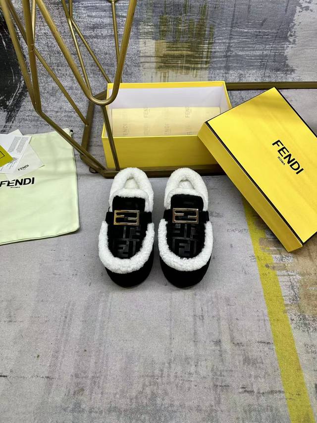 / Fendi最新休闲圆头平底半拖鞋。采用黑色绒面材质饰有同色系凸纹Ff图案。白色羊卷毛内衬和饰边。饰有金色饰面金属Baguette配饰。厚实的黑色防滑底,鞋跟Fe