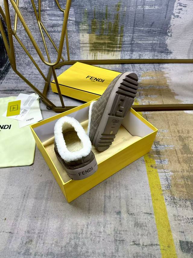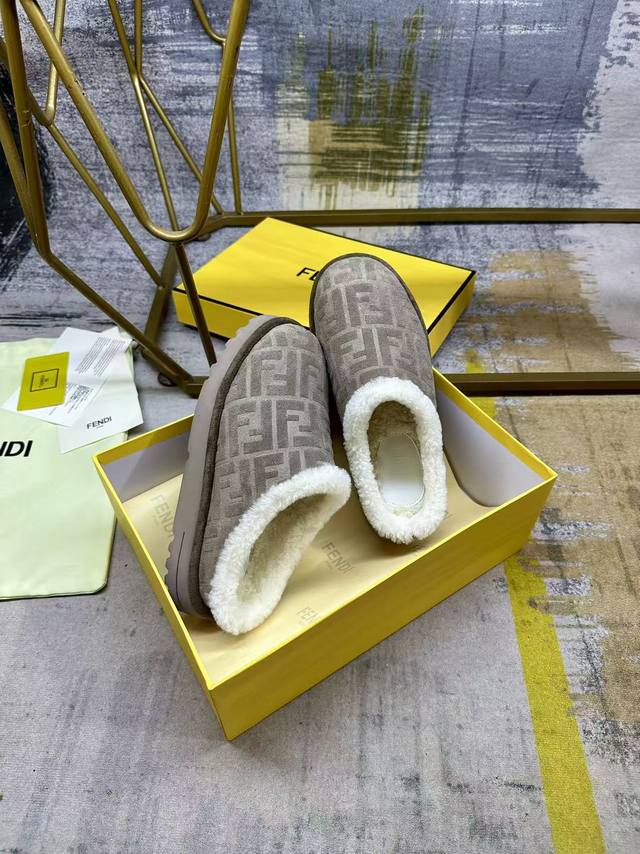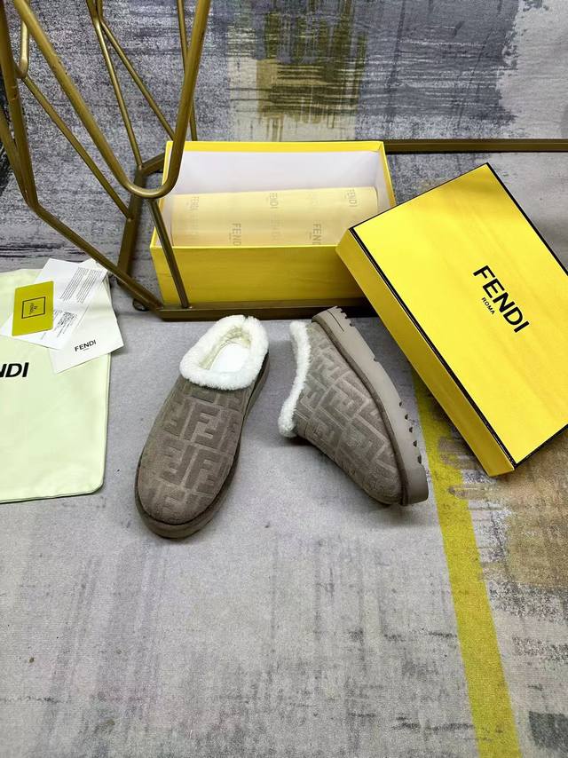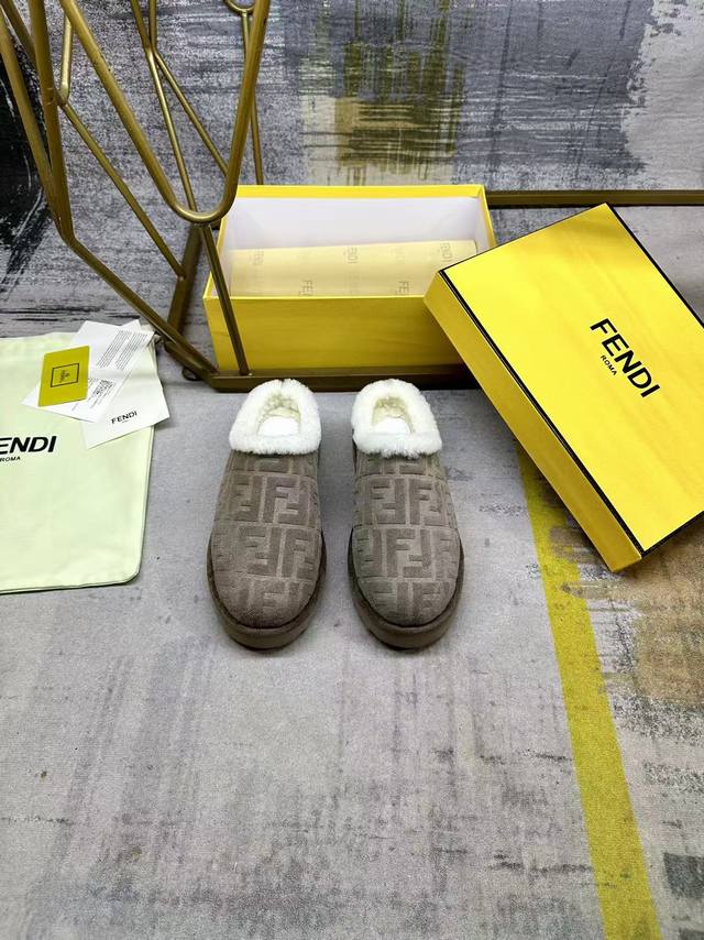 Fendi最新圆头男女同款平底半托鞋。采用灰色绒面材质压印同色系Ff图案。米白色羊卷毛衬里。女35-40码 ,男39-45码