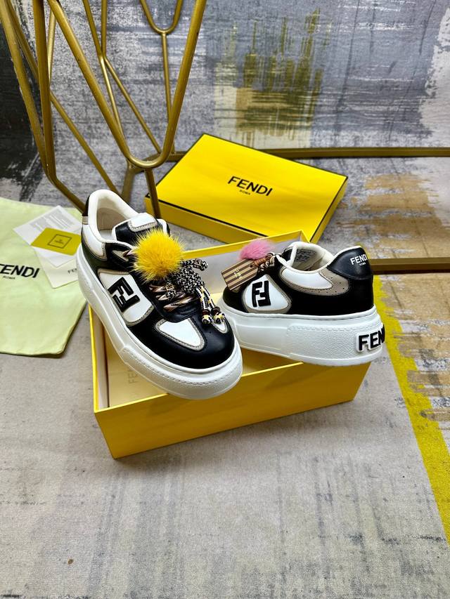 Fendi Match系带运动鞋。黑白色皮料侧面饰有黑色皮革Ff贴花,拼色鞋带。橡胶厚鞋底,后跟处饰有超大凸纹Fendi字样。鞋舌上饰有金属环挂饰:右鞋上饰有带黄色貂皮细节和金色金属Ff图案手链的编绳小玩偶。左鞋上饰有一条带撞色貂毛双绒球的编绳,饰有金属Ff圆珠,以及pequin印花图案和标志 玩偶可拆卸 ,35-42码, DDD