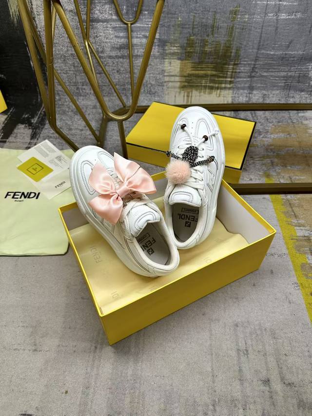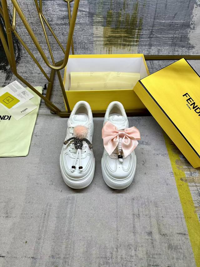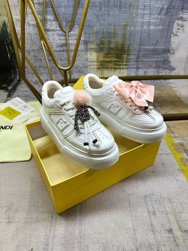 实价: Fendi Match系带运动鞋。白色皮革材质。侧面饰有同色系皮革Ff贴花,配白色鞋带。橡胶厚鞋底,后跟处饰有超大凸纹Fendi字样。鞋舌上饰有金属环挂饰:右鞋上饰有带粉红色貂皮细节和金色金属Ff图案手链的编绳小玩偶。左鞋上饰有配白色和粉红色绳索的大号粉红色塔夫绸蝴蝶结和金色金属Ff和树脂玳瑁效果珠饰 玩偶可拆卸 35-42码 DDD
