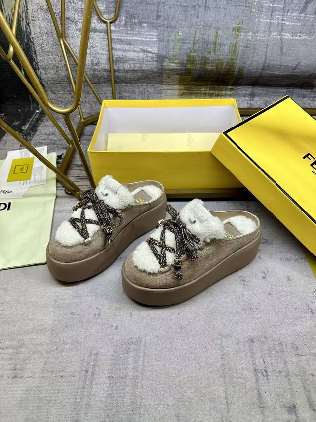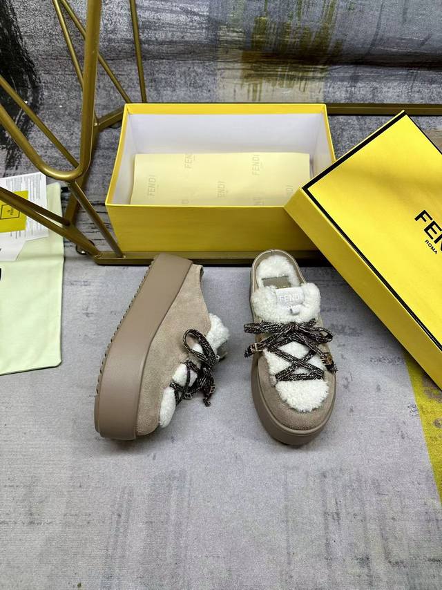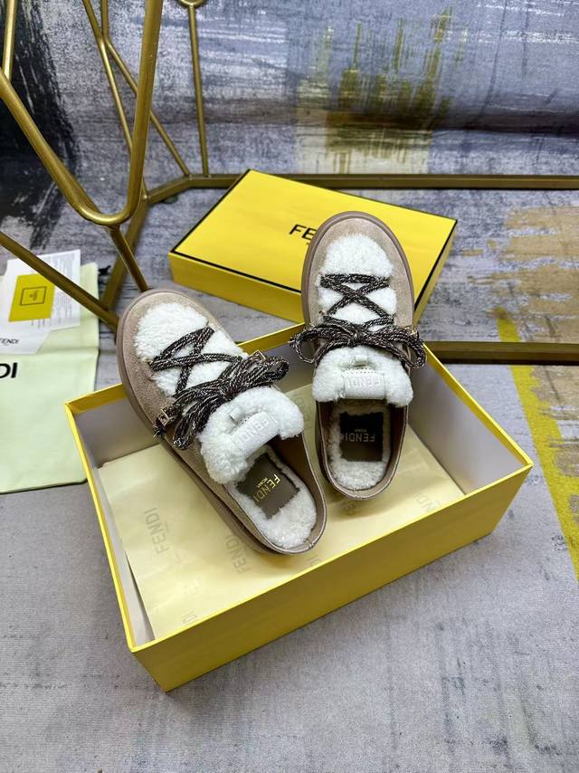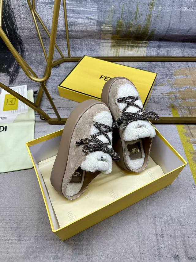 FFF 工厂P价 女装女鞋 运动原单滑雪后休闲圆头平底鞋。浅卡其色绒面革材质,白色羊卷毛鞋面和内底。拼色编织登山风格鞋带,饰有圆形树脂效果金色金属Ff珠饰。厚实同色系橡胶鞋底,鞋跟饰有Fendi字样。35-42码 DDD