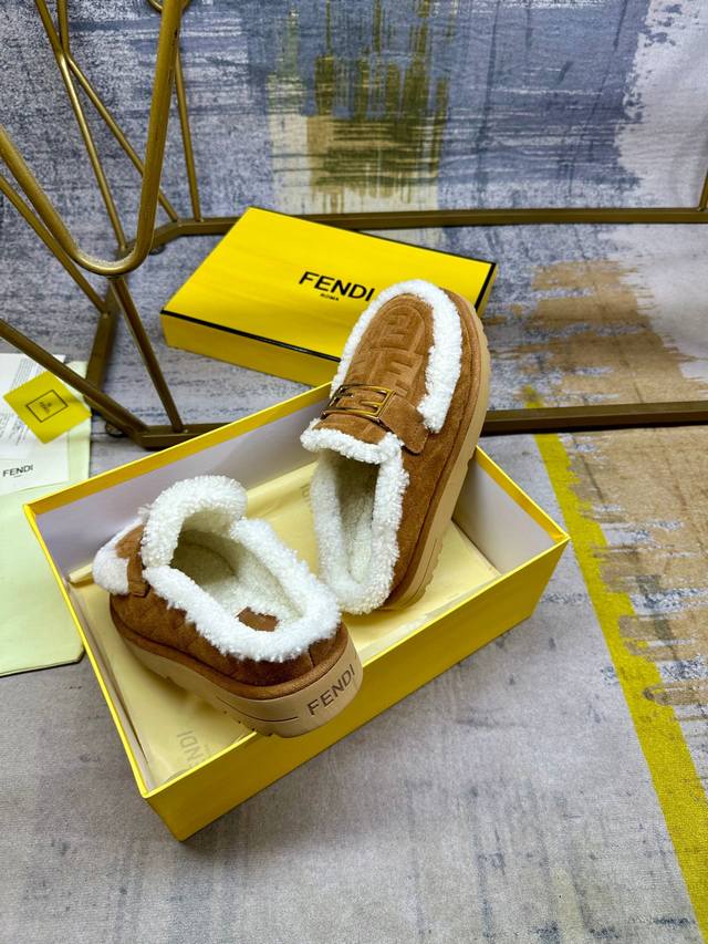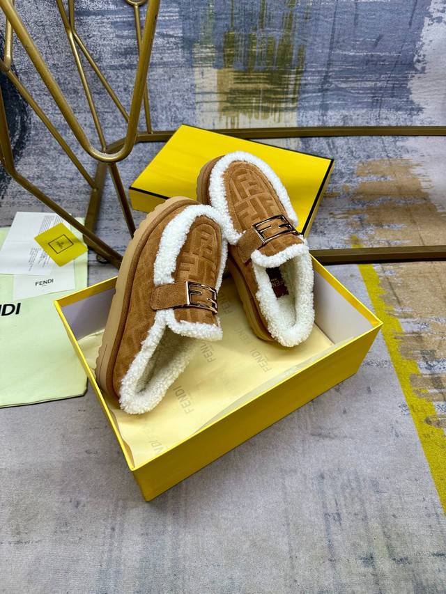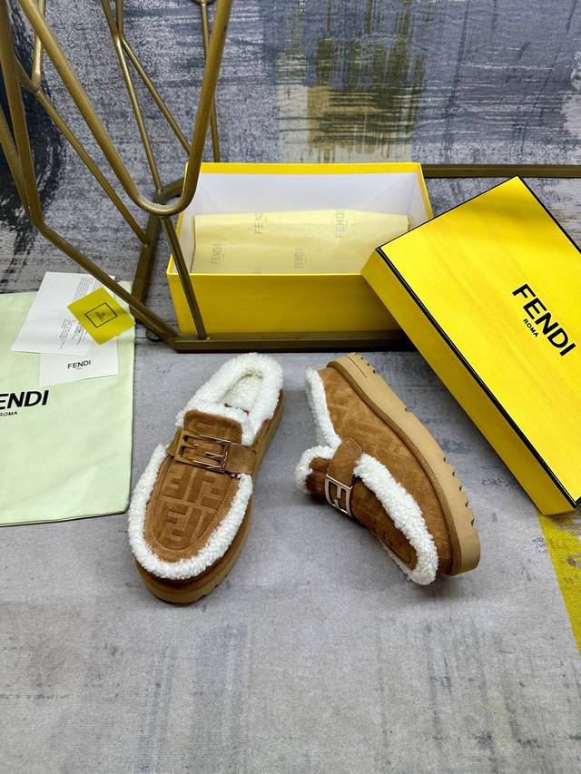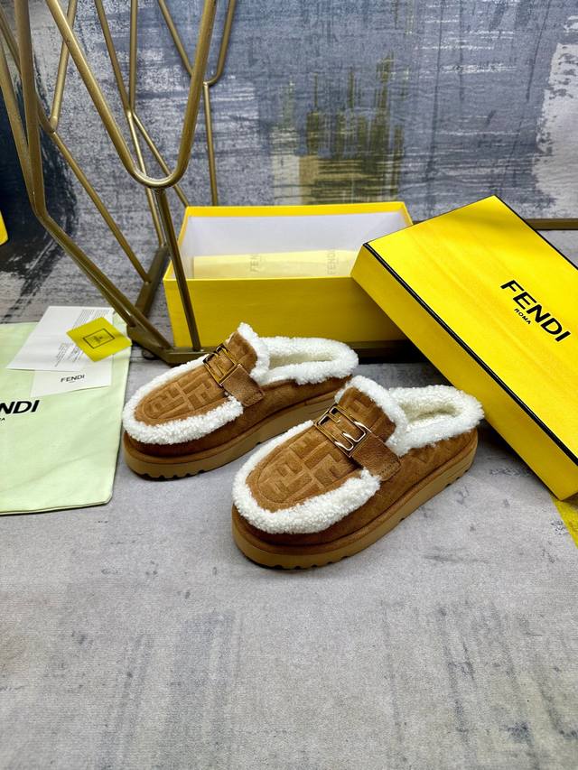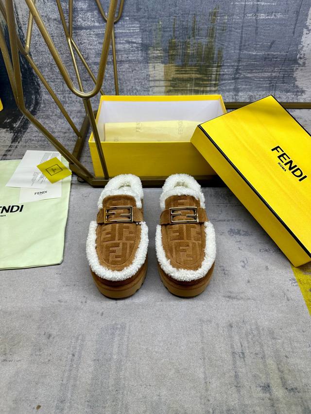 / 工厂p价 女装女鞋 运动原单 Fendi最新休闲圆头平底半拖鞋。采用棕色绒面材质饰有同色系凸纹Ff图案。白色羊卷毛内衬和饰边。饰有金色饰面金属Baguette配