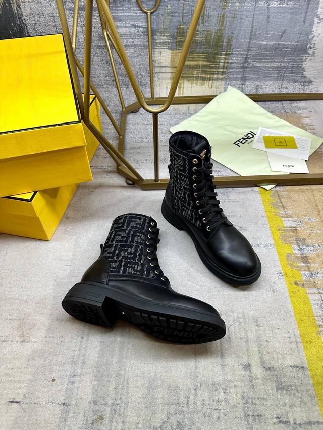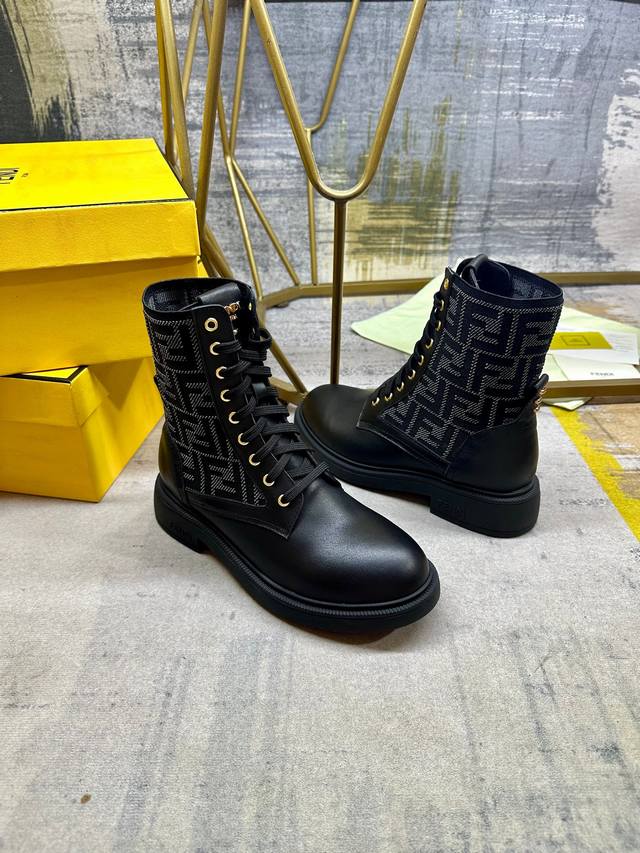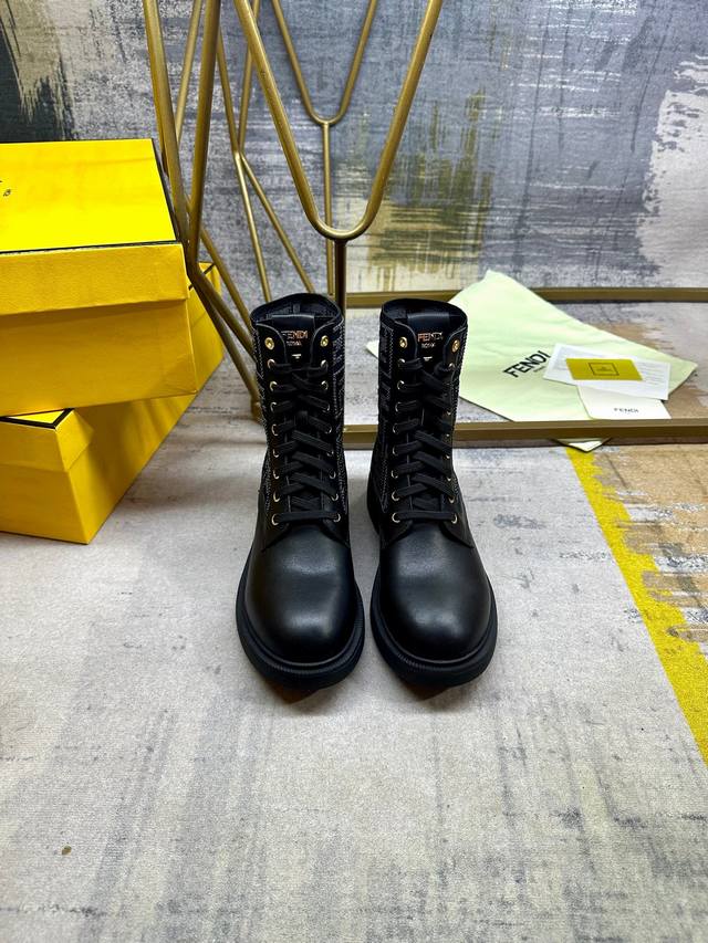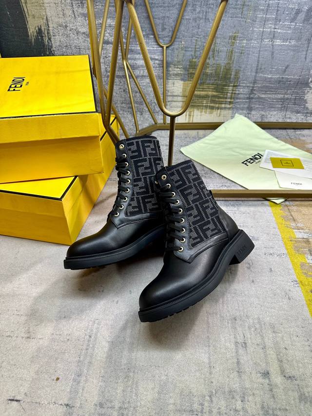 工厂p价 女装女鞋 运动原单 Fendi Filo圆头机车靴。黑色牛皮和灰色弹力料材质,饰有黑色标志性Ff图案。饰有金属孔眼、Fendi Roma字样。橡胶鞋底,鞋跟侧面饰有Fendi字样。35-42码 DDD