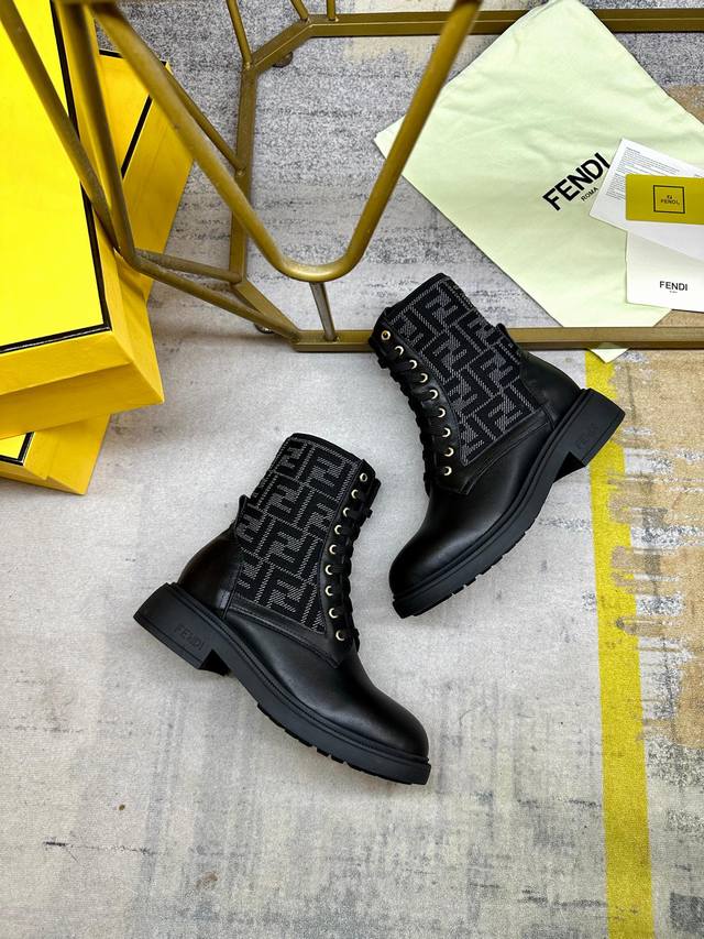 工厂p价 女装女鞋 运动原单 Fendi Filo圆头机车靴。黑色牛皮和灰色弹力料材质,饰有黑色标志性Ff图案。饰有金属孔眼、Fendi Roma字样。橡胶鞋底