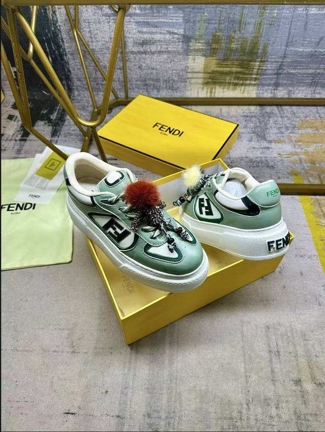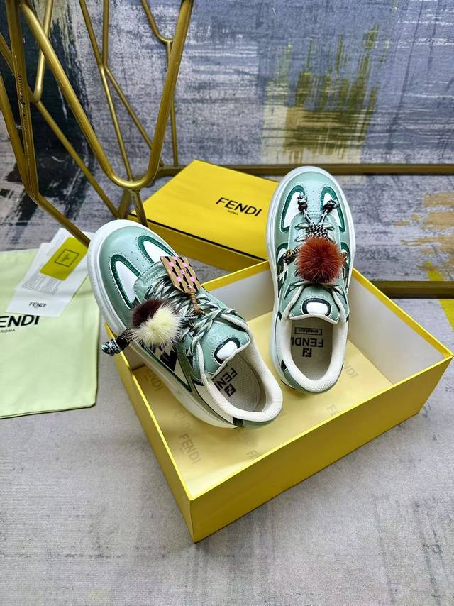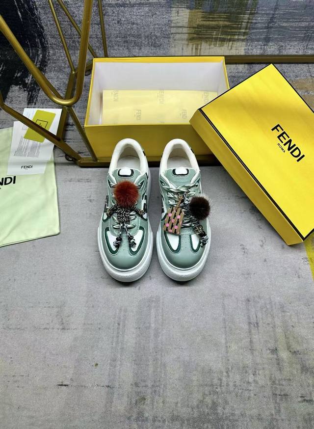 工厂P价 女装女鞋 运动原单 Fendi Match系带运动鞋。浅绿色面料,带绿色细节。侧边饰有撞色皮革Ff贴花,白色和绿色登山鞋带。橡胶厚鞋底,后跟处饰有超大凸纹压花Fendi字样。鞋舌上饰有金属环挂饰:右鞋上饰有带撞色貂毛细节和金色金属Ff图案手链的编绳小玩偶。左鞋上饰有一条带撞色貂毛双绒球的编绳,饰有金属Ff圆珠以及Pequin印花图案和标志 玩偶可拆卸 ,35-42码