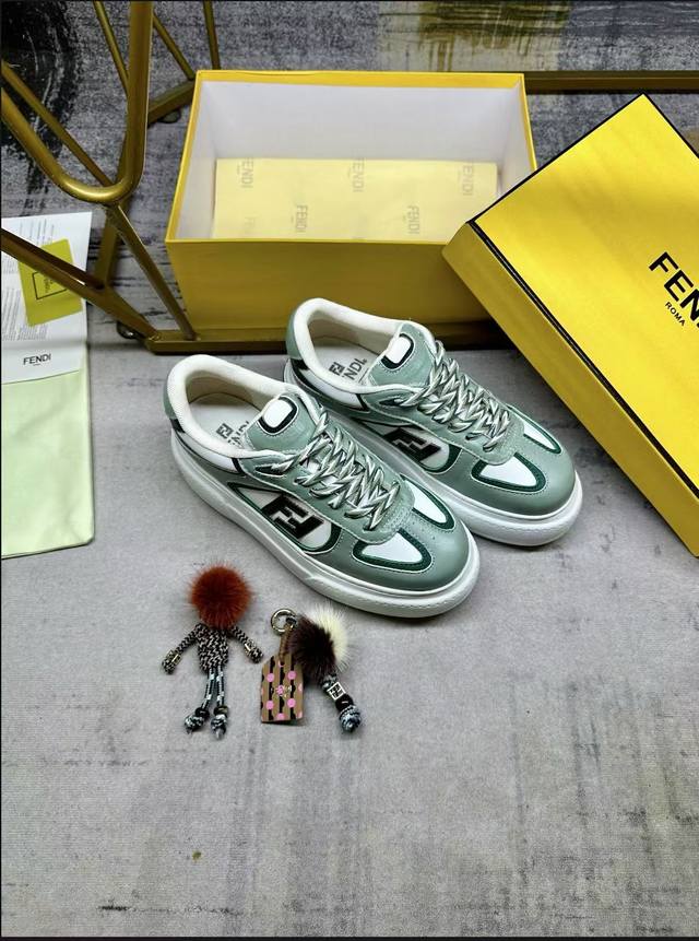 / 工厂P价 女装女鞋 运动原单 Fendi Match系带运动鞋。浅绿色面料,带绿色细节。侧边饰有撞色皮革Ff贴花,白色和绿色登山鞋带。橡胶厚鞋底,后跟处饰有超大