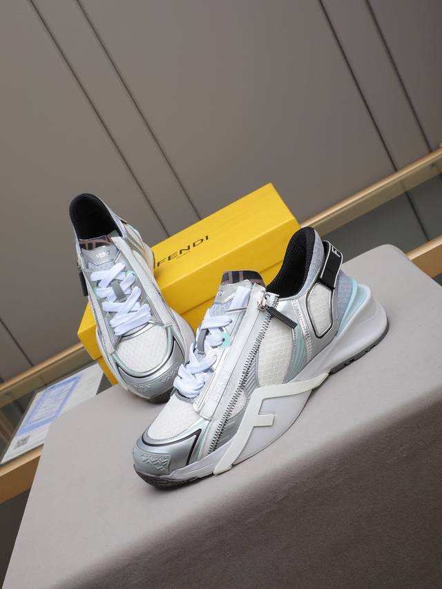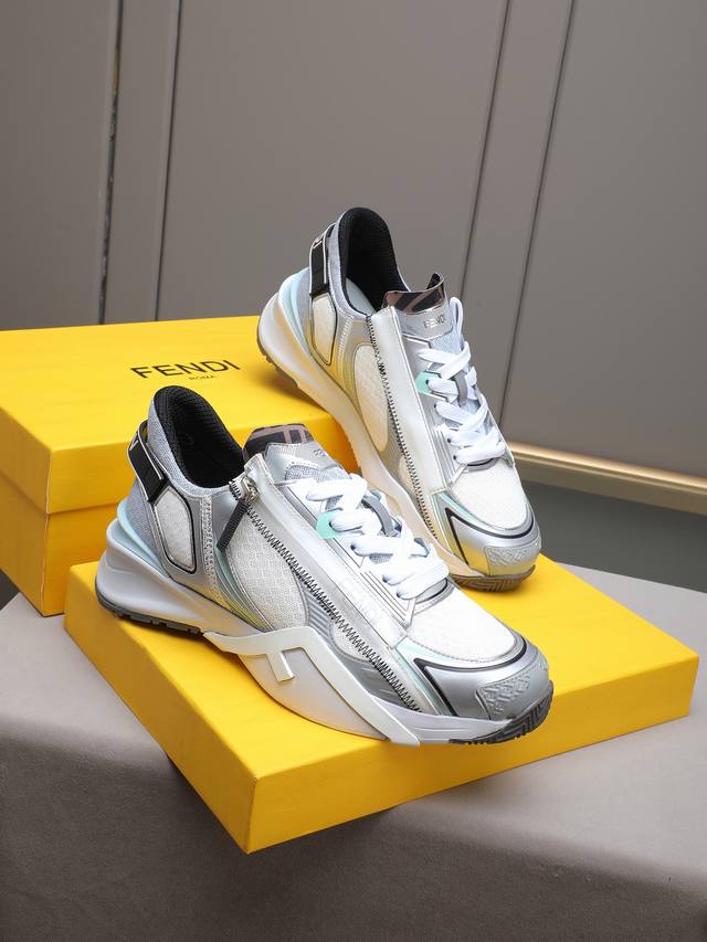 新品Fd休闲运动鞋,波浪形鞋底刻有F字样。鞋跟饰有凸纹压花Fend* Flow字样。鞋面牛皮接拼独特创新!超轻耐磨Eva鞋底,整体轻便舒适!Size:39-44