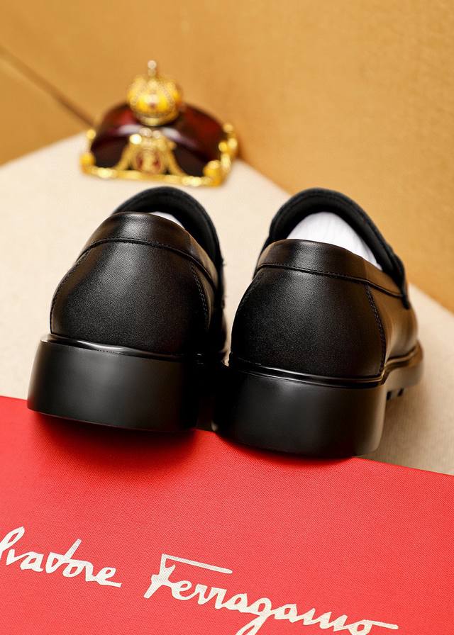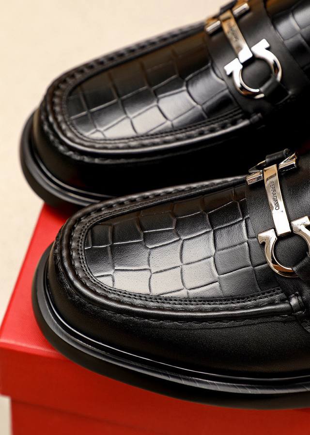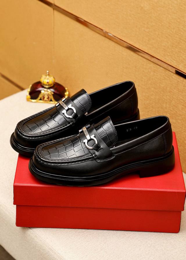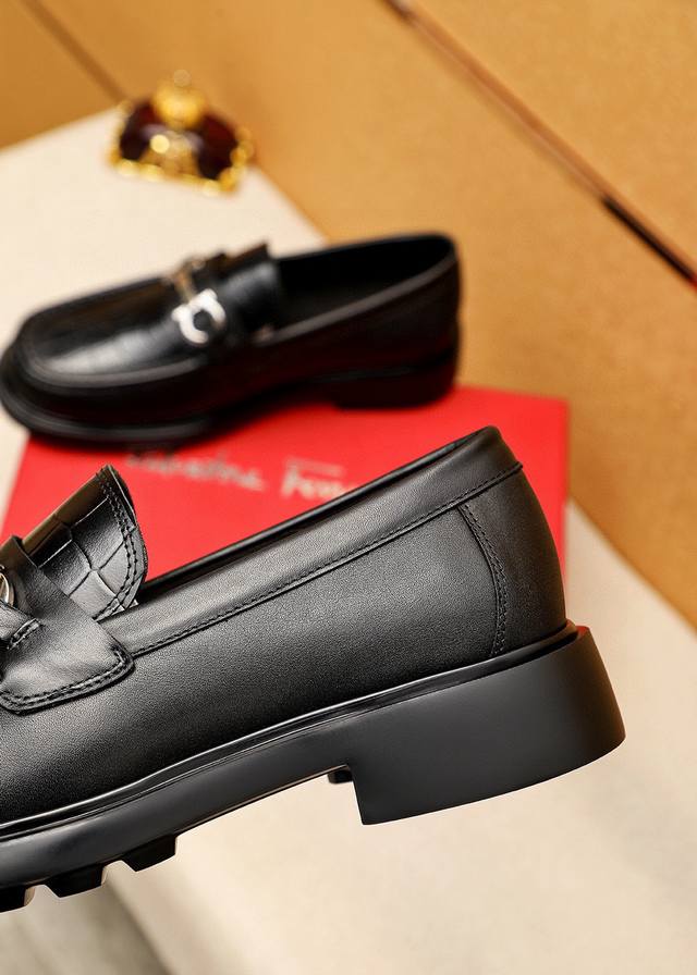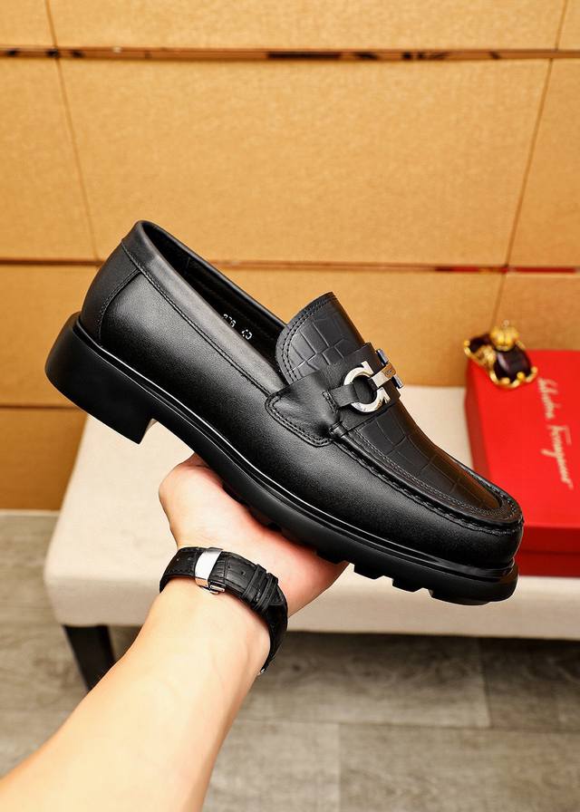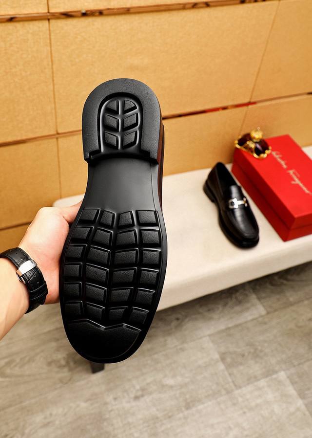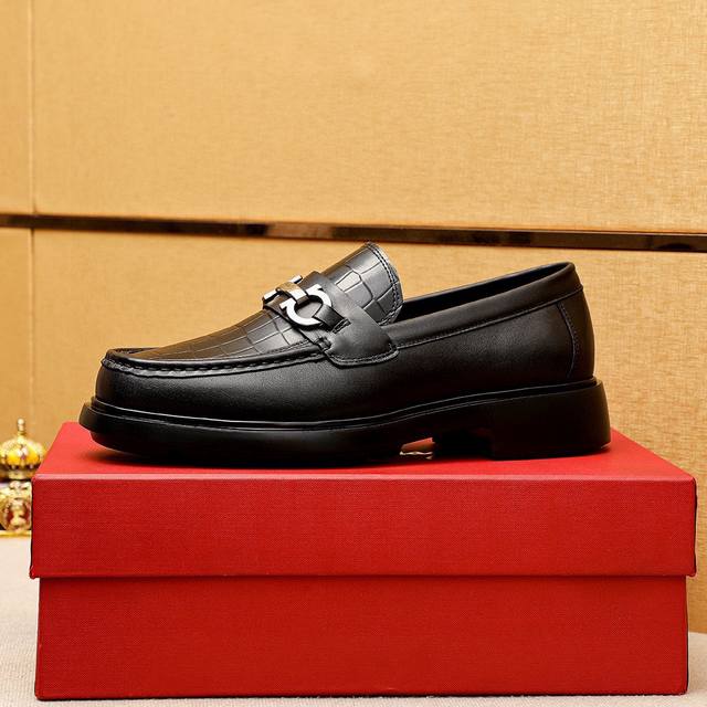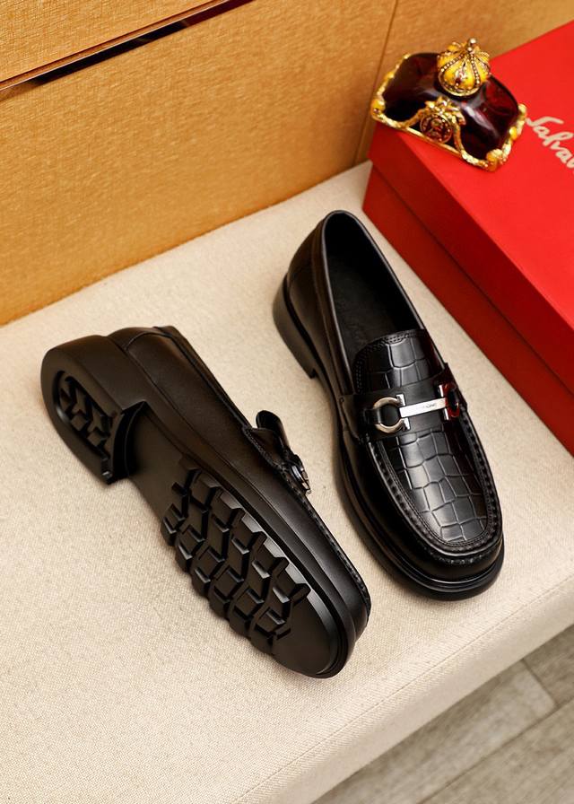 商品商标: 菲拉格慕 休闲皮鞋 DDD 正码码数: 38-44 45.46订制 DDD 商品材料:精选 进口头层小牛皮压花鞋面+奢华五金扣,进口水染牛皮内里。强烈立体视觉效果,原版发泡大底 DDD 颜 色:1色可选 DDD