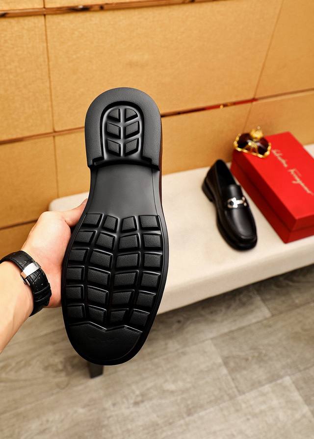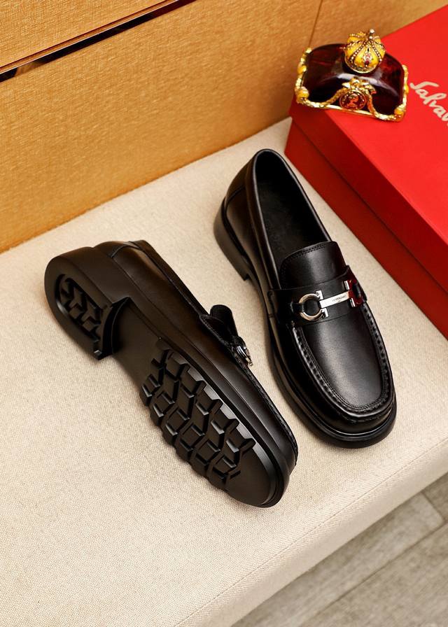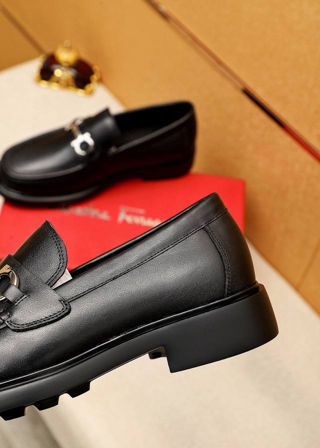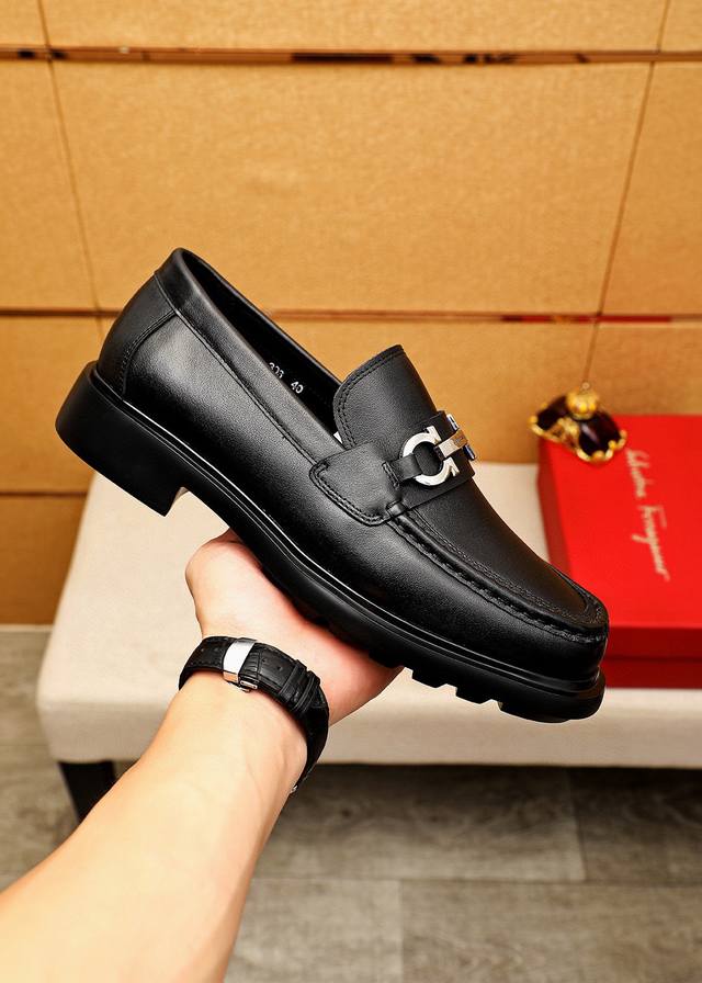 商品商标: 菲拉格慕 休闲皮鞋 DDD 正码码数: 38-44 45.46订制 DDD 商品材料:精选 进口头层小牛皮鞋面+奢华五金扣,进口水染牛皮内里。强烈立体视觉效果,原版发泡大底 DDD 颜 色:1色可选 DDD