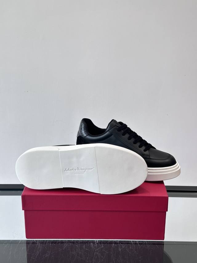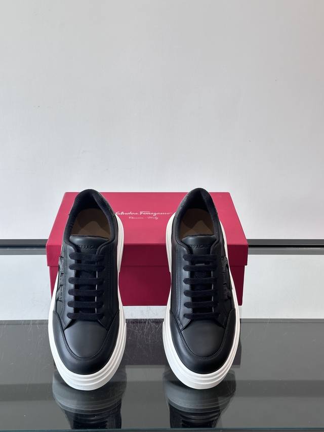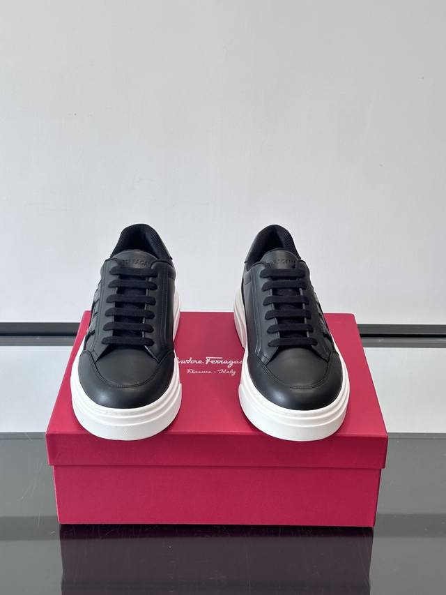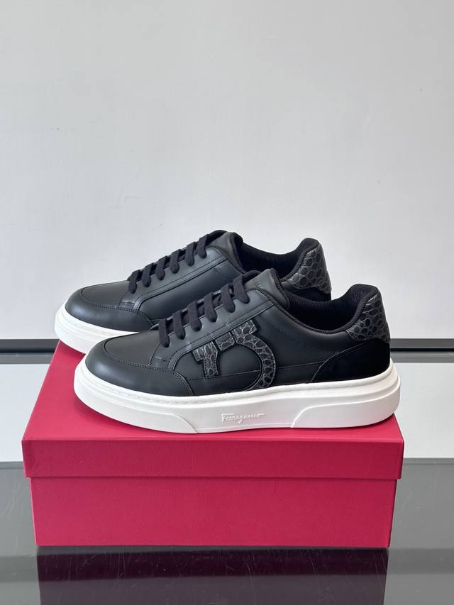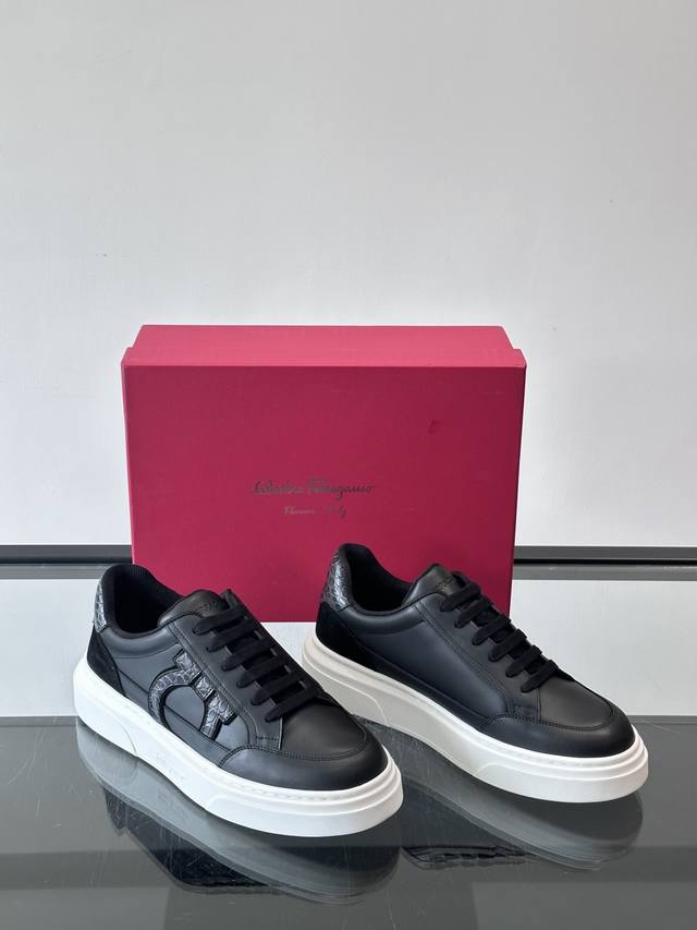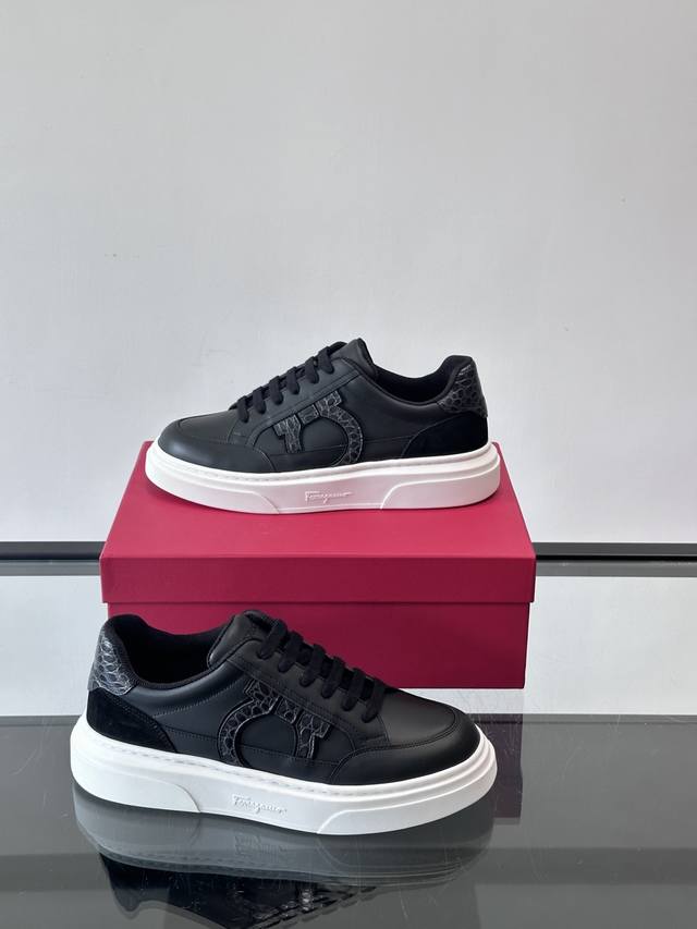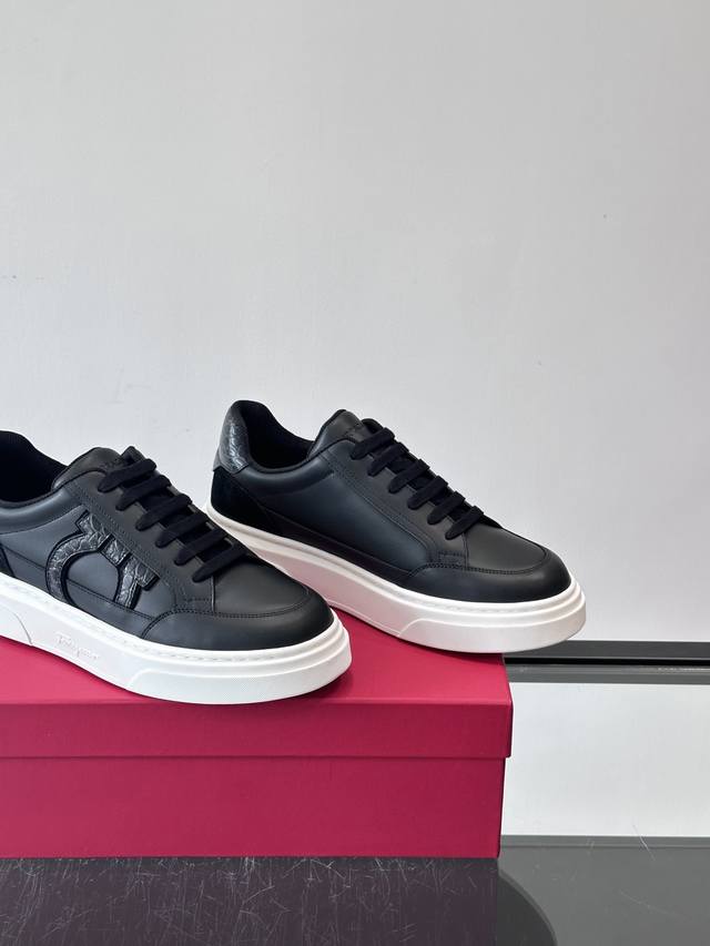 Ferragam* Gancini运动鞋 DDD 男士菲拉格慕Gancini系列低帮运动鞋,皮革+麂皮拼接,侧面有标志性Gancini饰扣,简约又有辦识度。厚底设计,穿着舒适还能悄悄增高,日常休闲穿搭超百搭!◎ DDD Size:38-44 45.46定做不退换 DDD