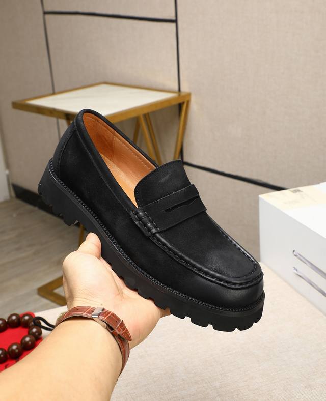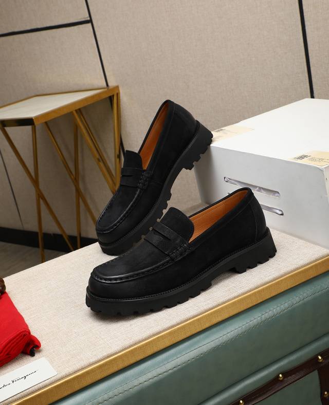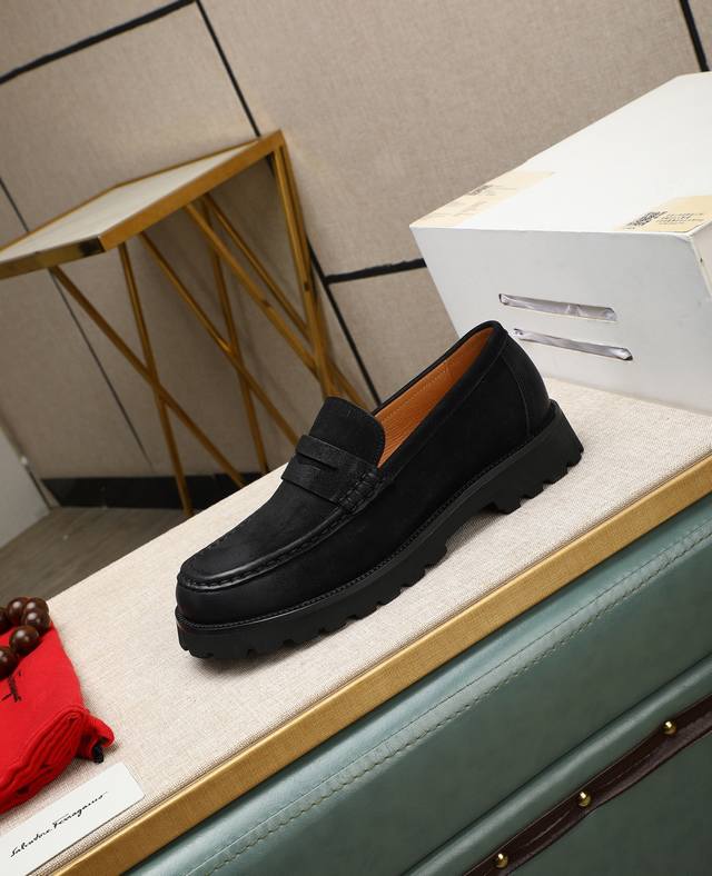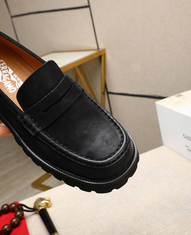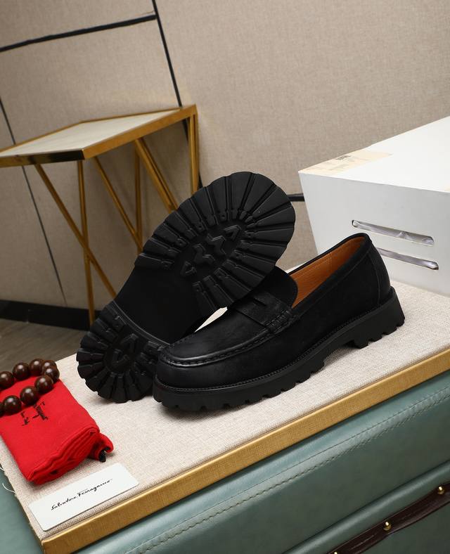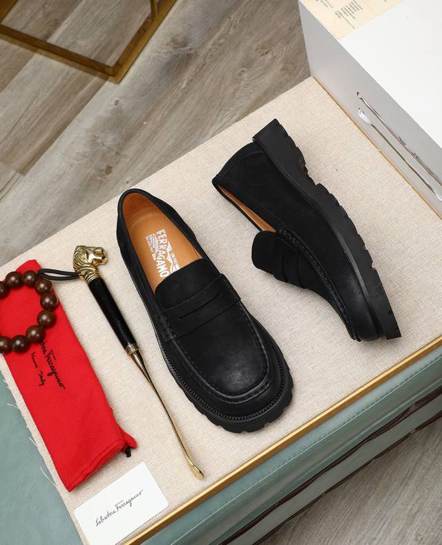 高帮菲拉格慕休闲皮鞋,进口头层磨砂牛皮乐福鞋将工致元素与摩登魅力融合,韧性强耐折不易变形,经久耐穿!皮里!发泡超...