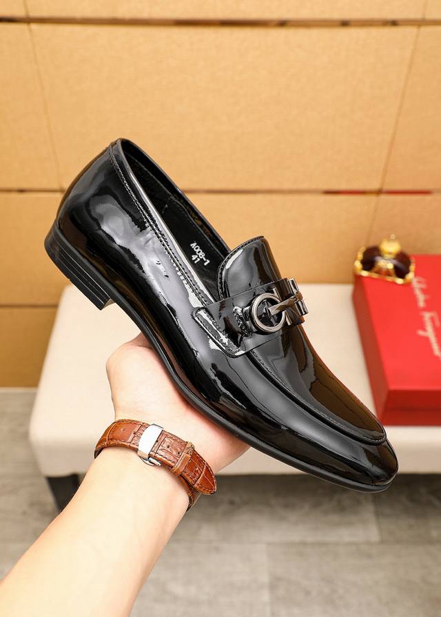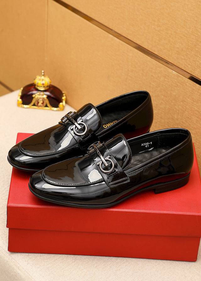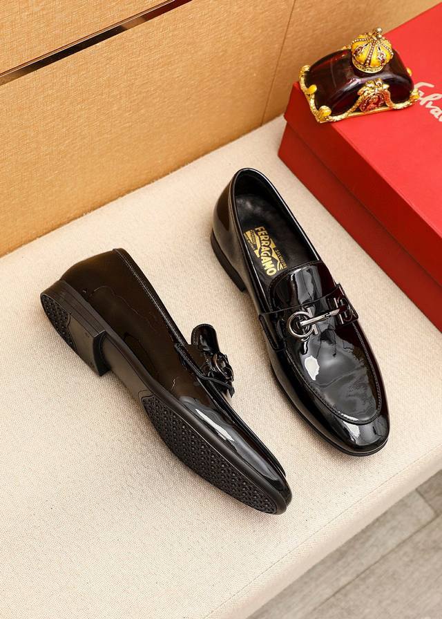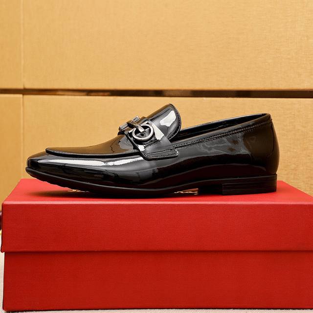 商品商标:Ferragamo 菲拉格慕 休闲皮鞋 正码码数: 38-44 45订制 商品材料:精选 进口头层漆皮鞋面+经典五金扣,进口水染牛皮内里。强烈立体视觉效果,橡胶大底 颜 色:1色可选