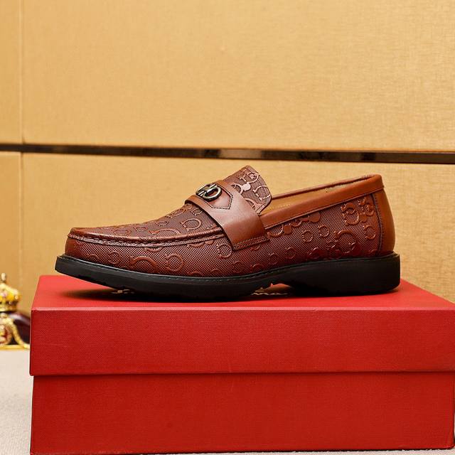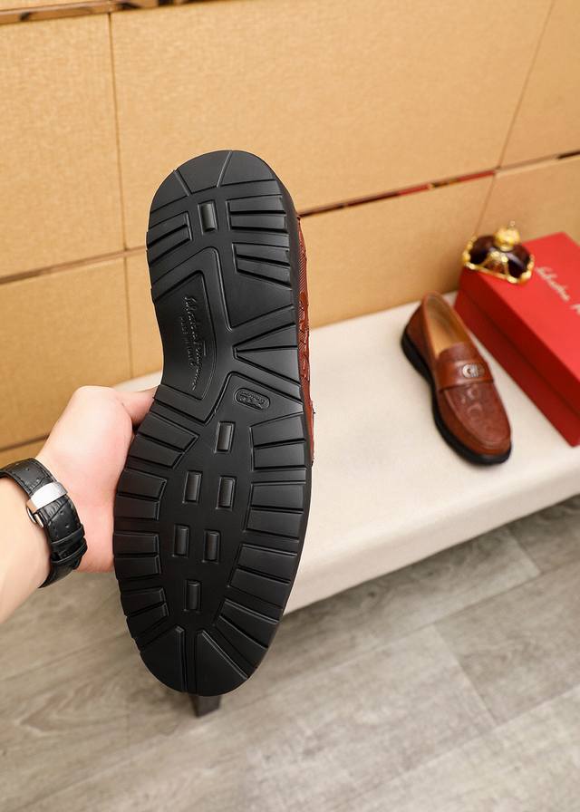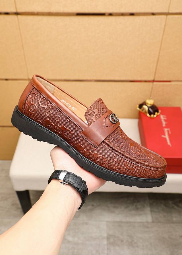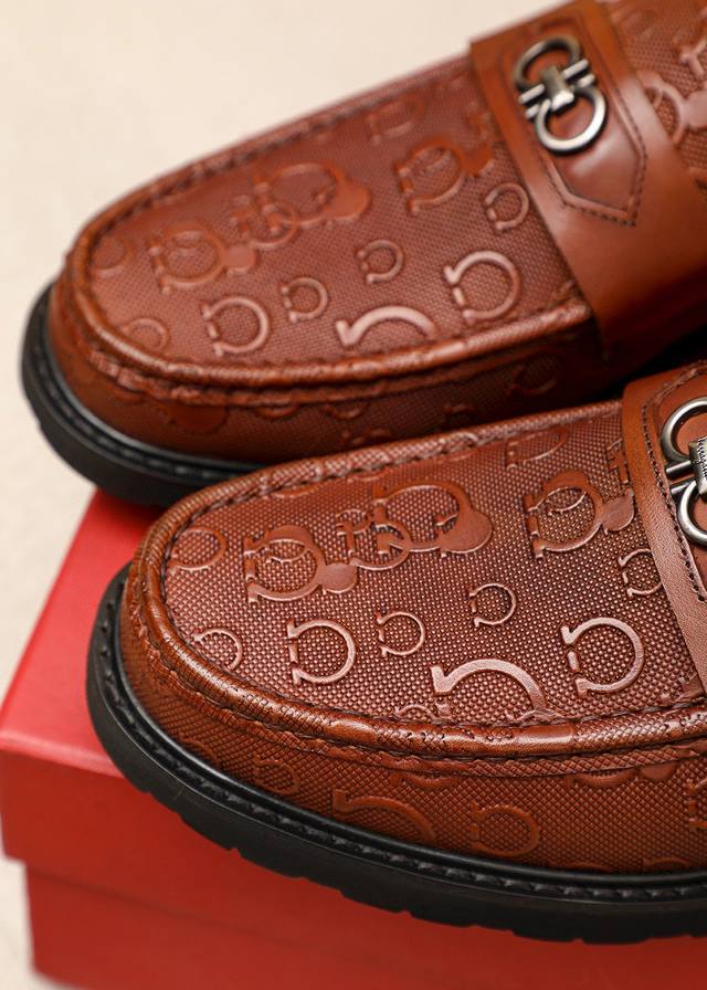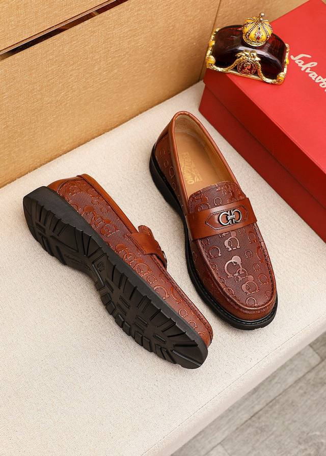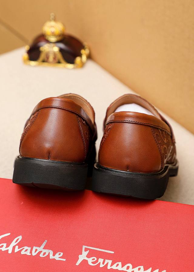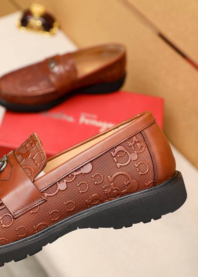 商品商标 Ferragamo 菲拉格慕 休闲皮鞋 正码码数: 38-44 45.46.47订的制 商品材料 精选 进口头层小牛皮压花鞋面+原版五金扣...