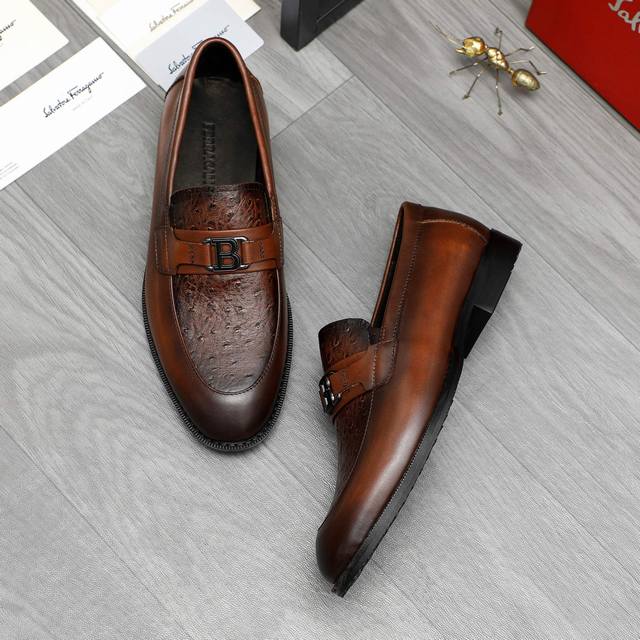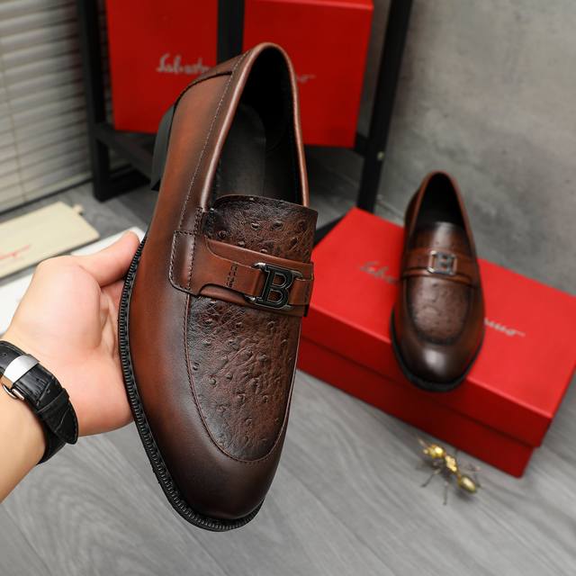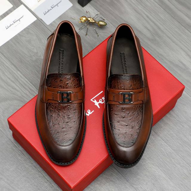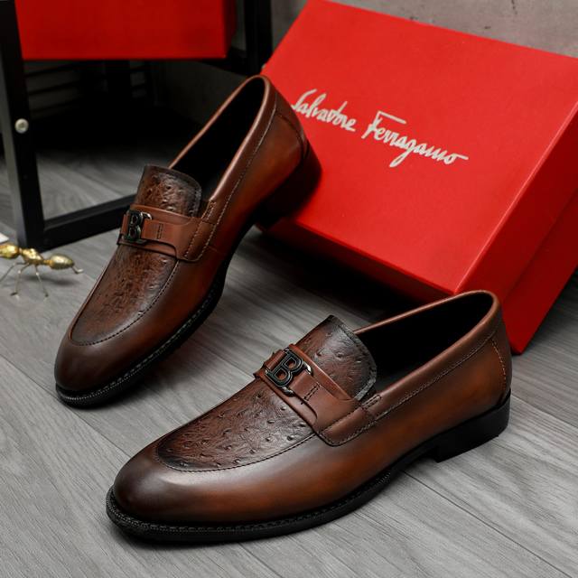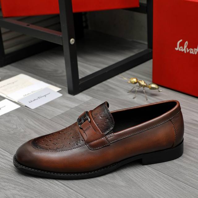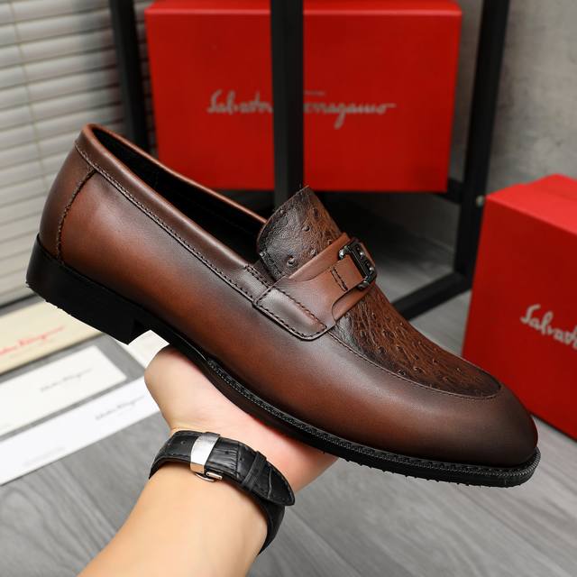 / 调工厂P价 男装男鞋 运动原单 商品商标:Ferragamo 菲拉格慕 商务休闲套脚皮鞋 正码码数: 39-45 45.定做不退换 商品材料:精选 擦色驼鸟纹牛