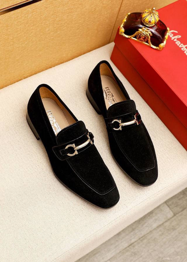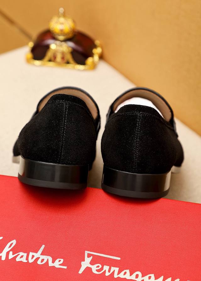 高端品质 菲拉格幕新款 官网男士套脚鞋同步款,鞋面选用进口反绒牛皮,最新品牌元素G家五金拉环扣,菲拉格慕官网最新 彰显不俗的气息,设计简约套脚款型 超级百搭 内里头层水染牛皮里。原版橡胶底,码数38-44。 45订制