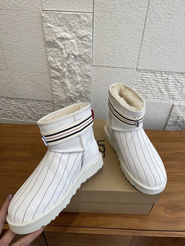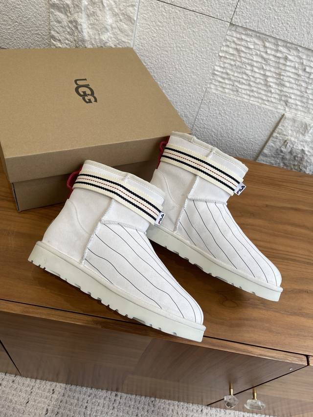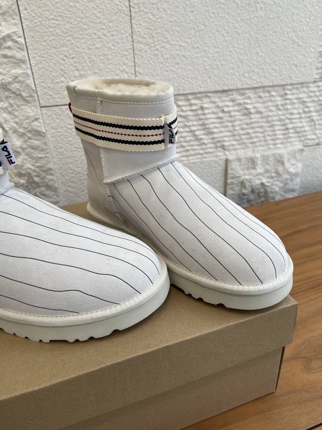 顶级版本: DDD Ugg X Fila 2025 秋冬新款 联名款雪地靴 DDD Ugg联手Fila推出的联名雪地靴,鞋面采用翻毛皮材质,内里填充羊毛,实现保暖与质感的结合。中筒靴型搭配侧边扣带设计,既提升了造型的时尚感,又可根据穿搭需求调节靴筒形态,如翻折变换风格。厚底设计兼具增高效果,适合冬季抗寒场景,能适配休闲、街头等多种穿搭风格。 DDD 面料:进口牛反绒 DDD 内里:进口羊毛 DDD 大底:原版开模Eva大底 DDD Size:35-40 40定做不退换 DDD